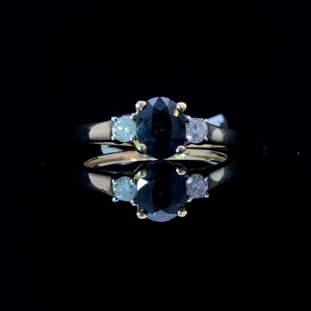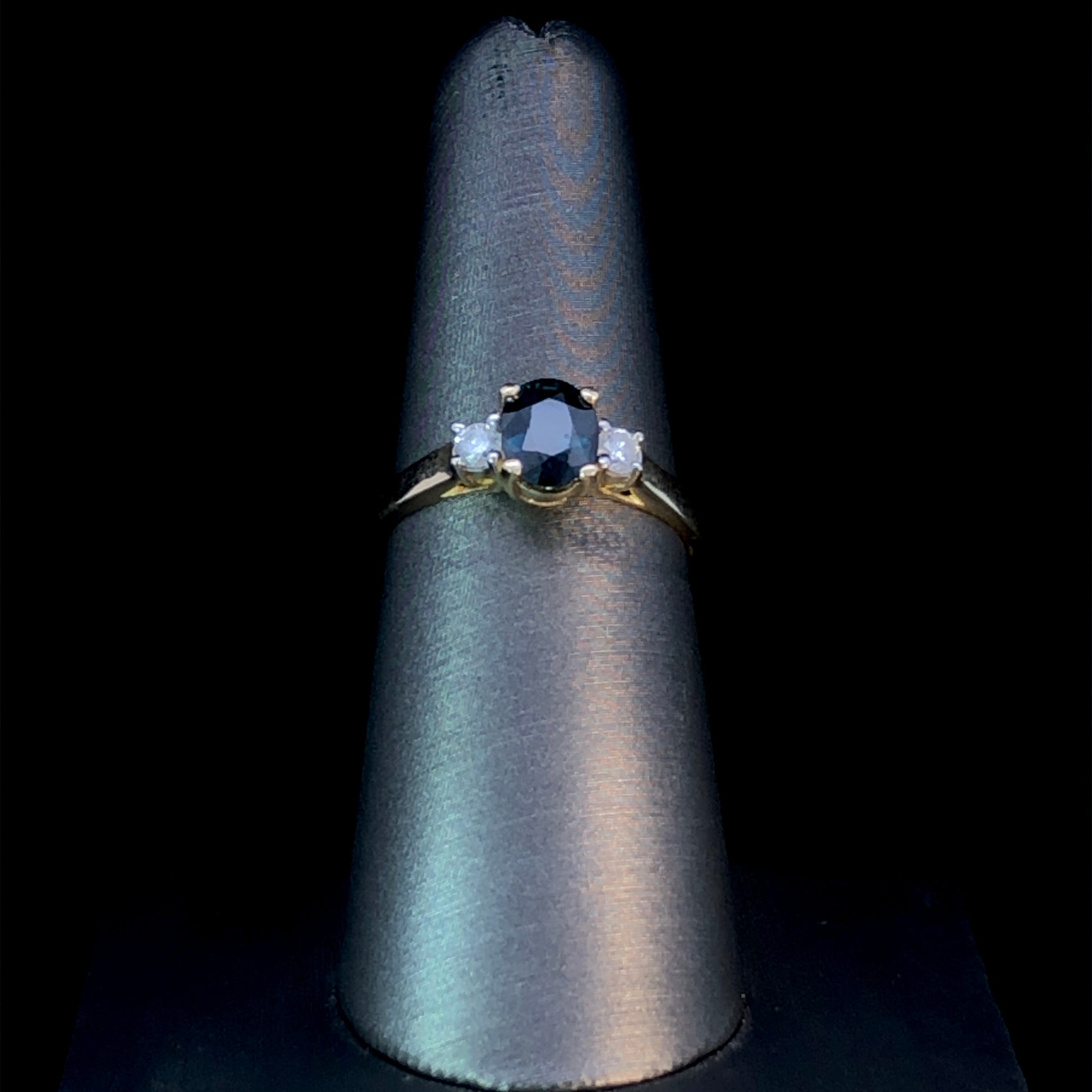 This exquisite 14kt yellow gold ring is a timeless addition to any wardrobe. Expertly-crafted, it showcases a charming 1.05ct oval sapphire in the center, flanked by two dazzling side diamonds totaling .20ctw for a truly luxurious and exclusive look. This ring is a size 7. If that size is not a perfect fit, first time sizing is free at the time of purchase. Additional sizing fees may apply.