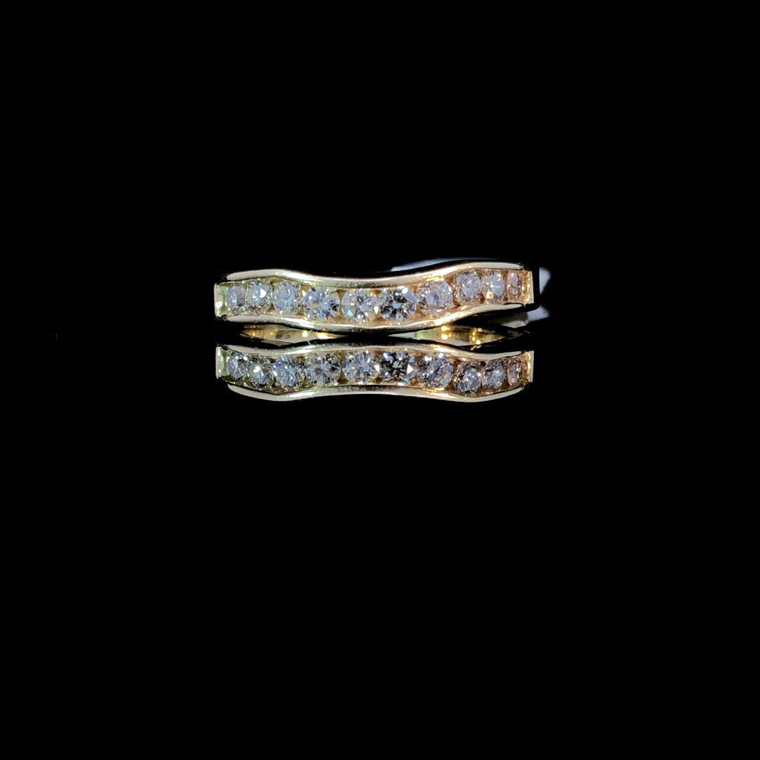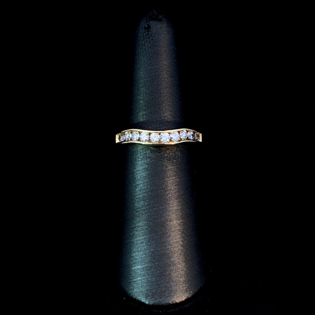 This stunning diamond contour band boasts a curved design, adorned with .45ctw of sparkling round diamonds in a channel setting. Crafted in 14kt yellow gold, it adds a touch of elegance and sophistication to any look. This ring is a size 6.75. If that size is not a perfect fit, first time sizing is free at the time of purchase. Additional sizing fees may apply.