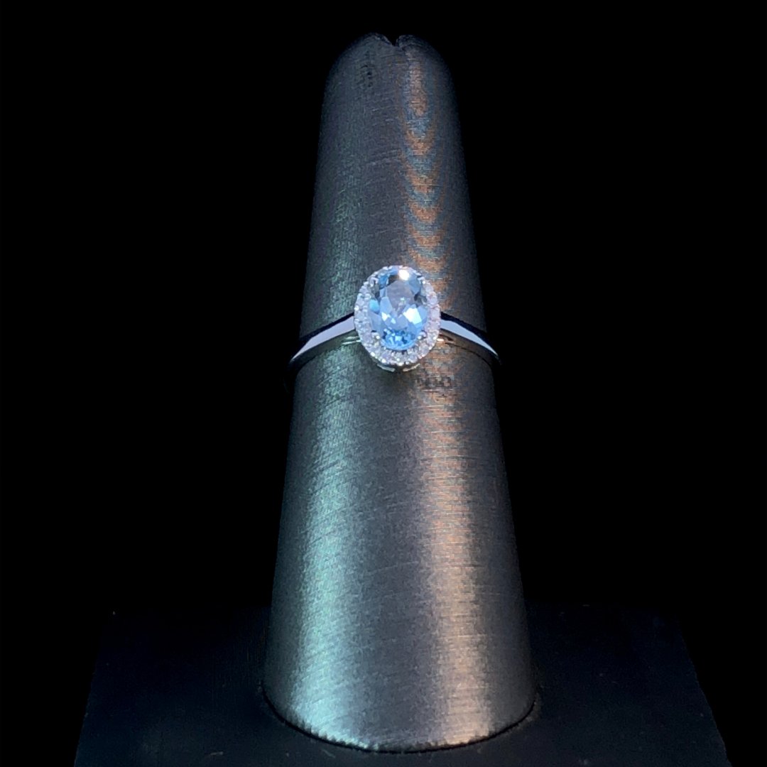 This luxurious ring is crafted from 14kt white gold and features an exquisite oval aquamarine at its center, expertly complemented with a halo of .08ctw of round diamonds. The beauty of this piece will take your breath away, adding a touch of glamour and elegance to every outfit. This ring is a size 6.75. If that size is not a perfect fit, first time sizing is free at the time of purchase. Additional sizing fees may apply.