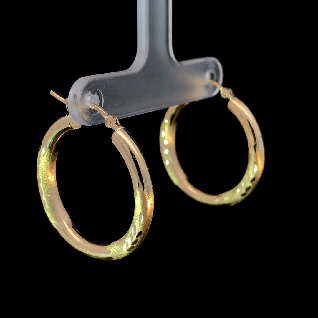 Accentuate your look with these refined 14kt yellow gold hoop earrings. Their polished and satin finishes are ornamented with exquisite diamond cut designs, creating a luxurious, sophisticated allure that will surely turn heads.