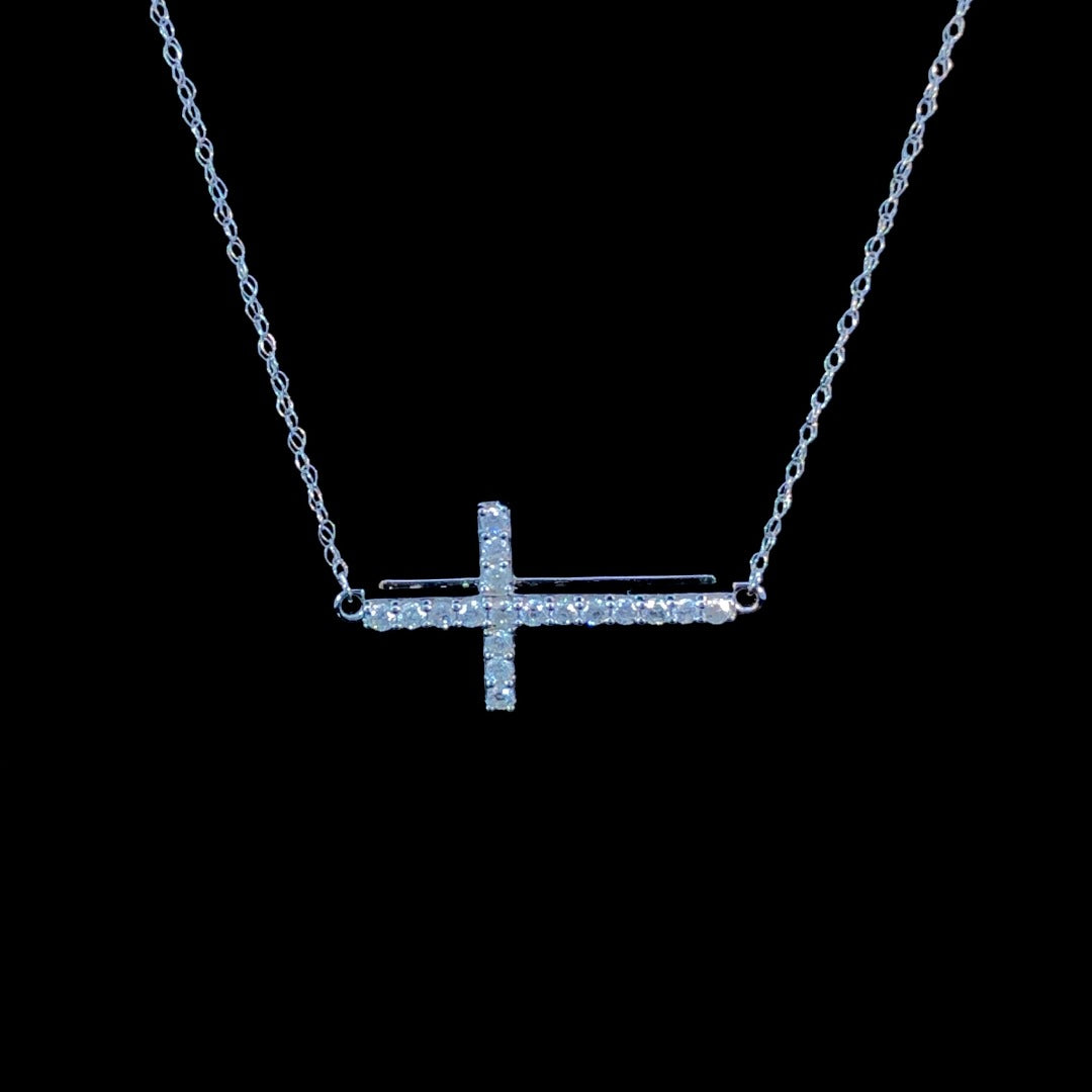 Instantly elevate any look with this stunning sideways cross necklace. Beautifully crafted with .18ctw of glimmering round diamonds set in shimmering 10kt white gold, it's perfect for any occasion. Delicately suspended from an 18 inch chain, its simple yet elegant design will elevate any look.