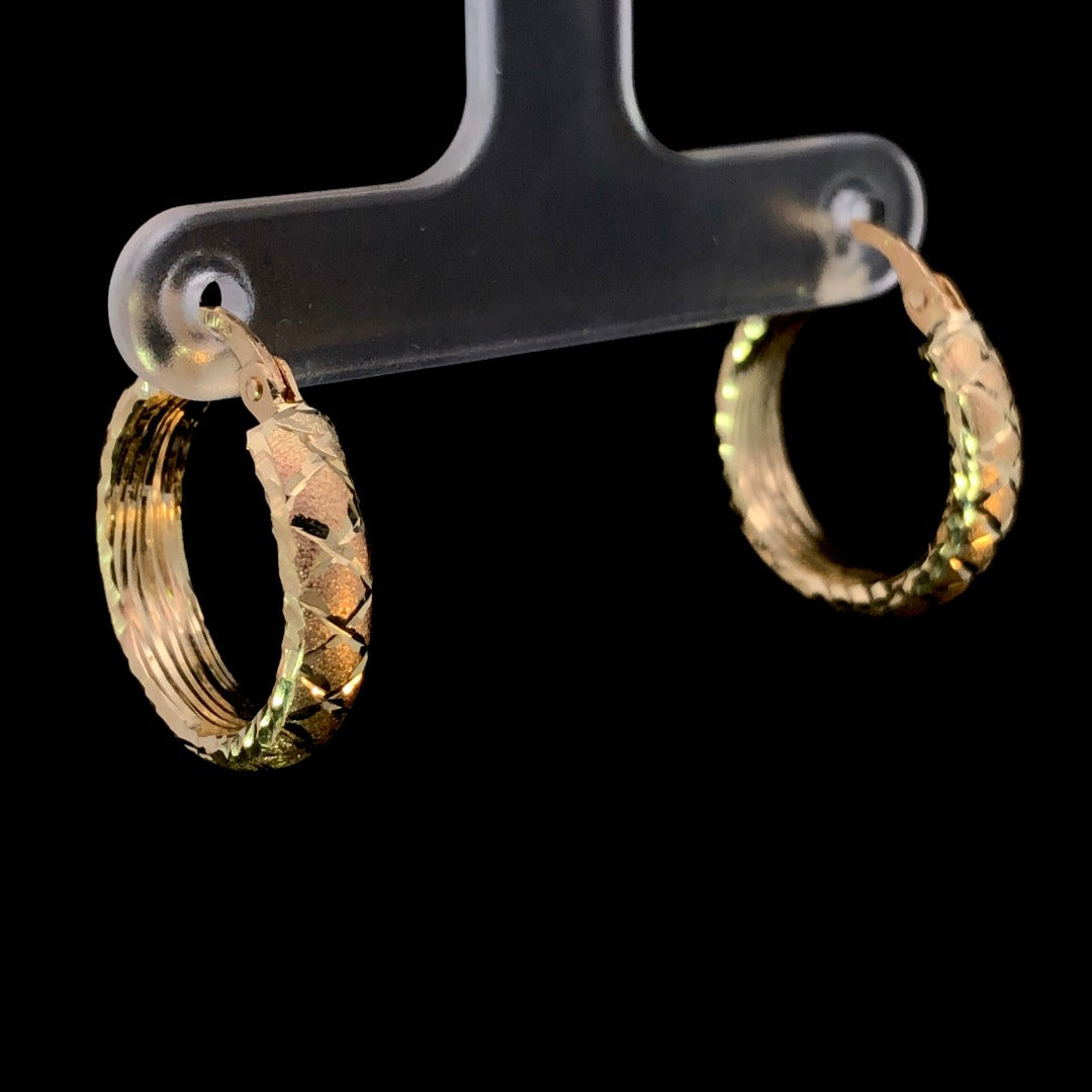 These 14 karat yellow gold hoop earrings are crafted with a sophisticated satin finish accentuated with delicate crisscross diamond-cut designs, adding a glimmer of brilliance to the wearer's style. With intricate attention to detail, these earrings offer an exclusive and tasteful look.