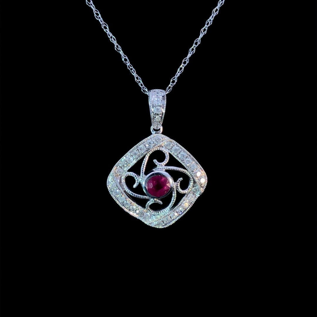 Adorn yourself with this luxurious pendant! Its sparkling round ruby is perfectly showcased by the bezel setting surrounded by a dazzling diamond halo and further accentuated by the white gold swirls. This .20ctw diamond masterpiece is sure to fill your wardrobe with glamour and elegance. Look and feel beautiful! Chain is not included.