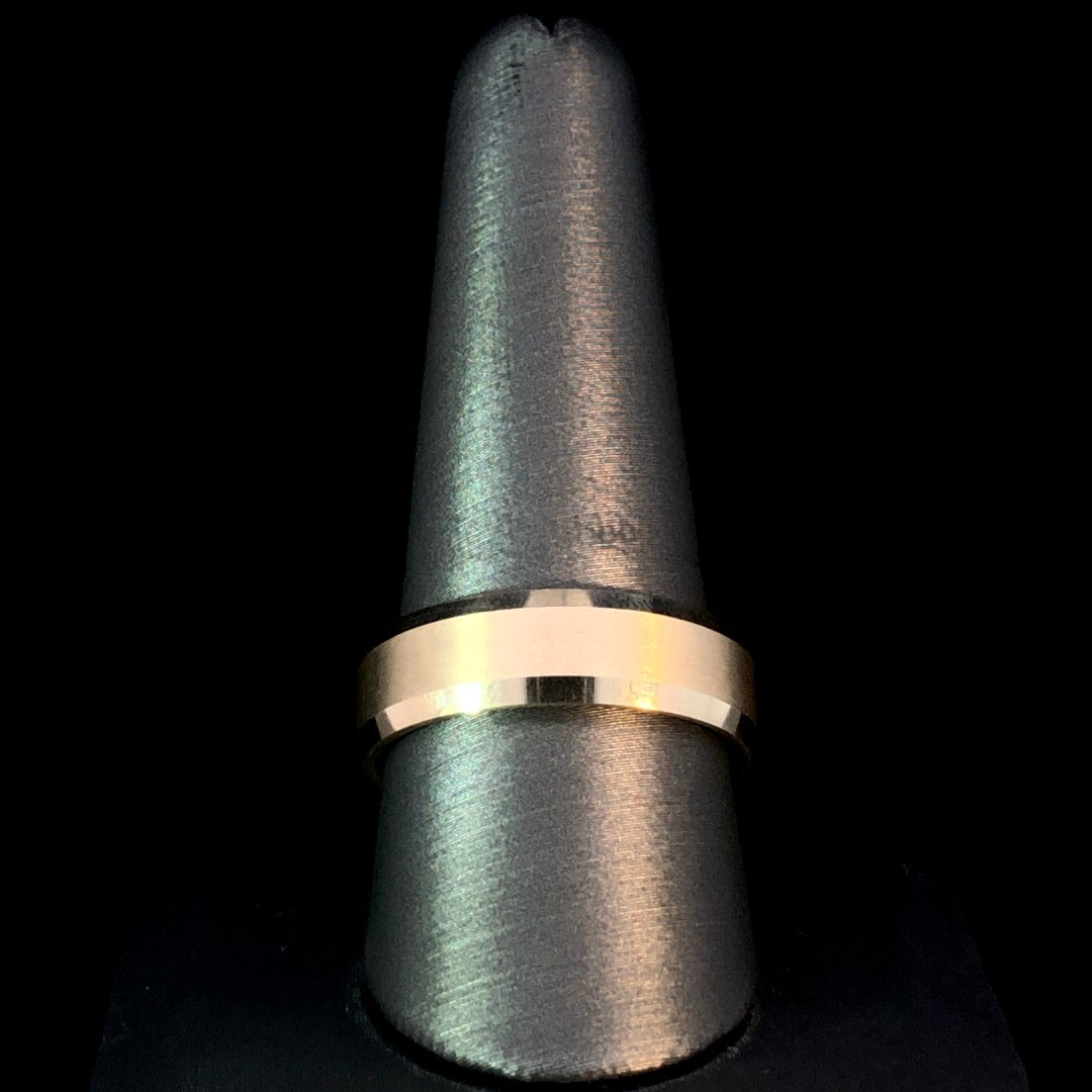 Beautifully crafted from 10kt yellow gold, this men's band features a classic beveled edge and a brushed finish center for an understated and timeless look. Perfect for adding a touch of sophistication to any look. This ring is a size 10. If that size is not a perfect fit, first time sizing is free at the time of purchase. Additional sizing fees may apply.
