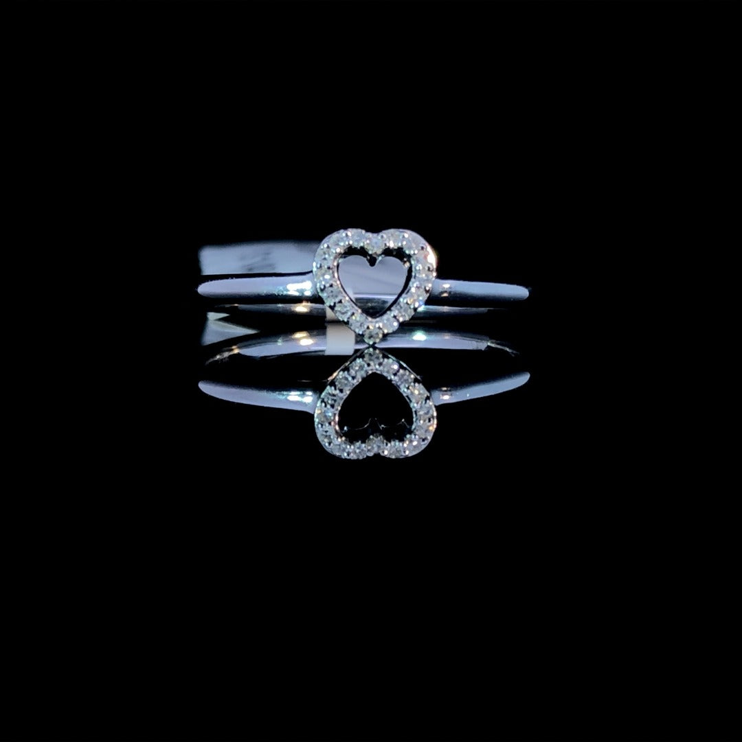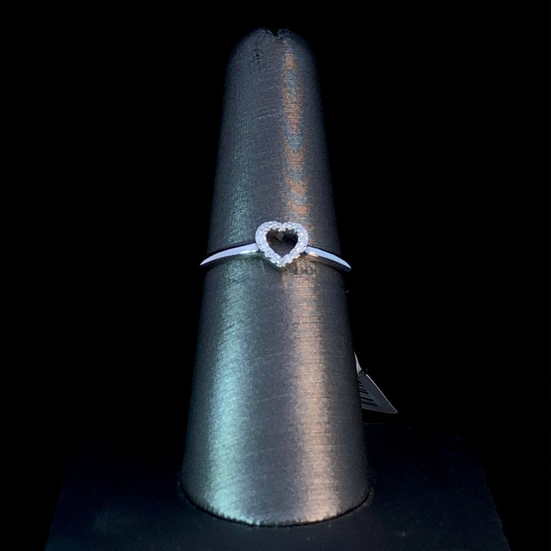 Sparkle with this dainty diamond ring. Crafted in lustrous 14k white gold, a delicate heart is adorned with .06ctw of glistening round diamonds, creating a precious piece of jewelry that is perfect for the modern romantic. Enjoy the exclusive sophistication of this elegant fashion ring. This ring is a size 7.25. If that size is not a perfect fit, first time sizing is free at the time of purchase. Additional sizing fees may apply.