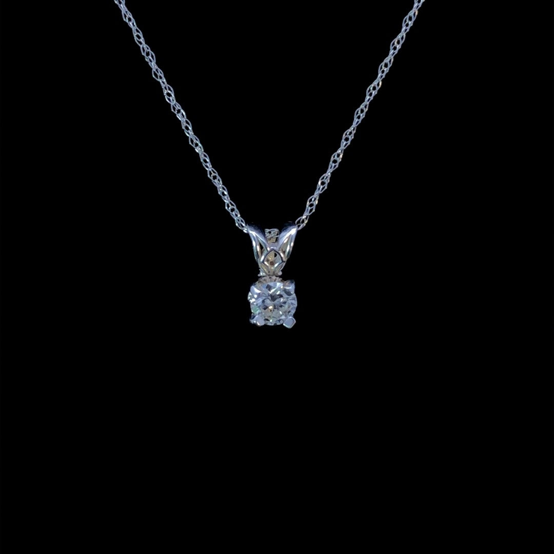 This luxurious diamond solitaire pendant is crafted with a .27ct round diamonds set in a 14kt white gold scroll pendant for a timelessly elegant look. Perfect for adding a touch of sparkle and sophistication to any outfit, the pendant is a beautiful way to express timeless style. Chain is not included.