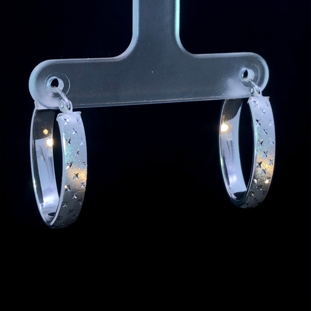 Adorn yourself with vibrant sparkle with these beautifully crafted 14kt white gold oval-shaped hoops. Featuring a glossy satin finish and intricate diamond-cut designs, these timeless earrings bring an exclusive, elegant touch to any look. Embrace the luxury of a chic and sophisticated style.