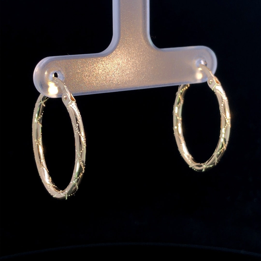 These 14kt yellow gold hoop earrings represent timeless elegance and sophistication. Carefully crafted with intricate designs, they offer a charming adornment to complete any outfit. Perfect for special occasions or everyday wear, these fine hoops will bring a touch of grace to your look.