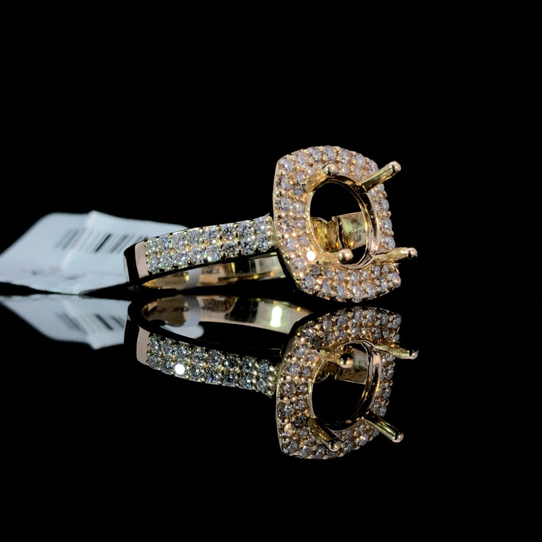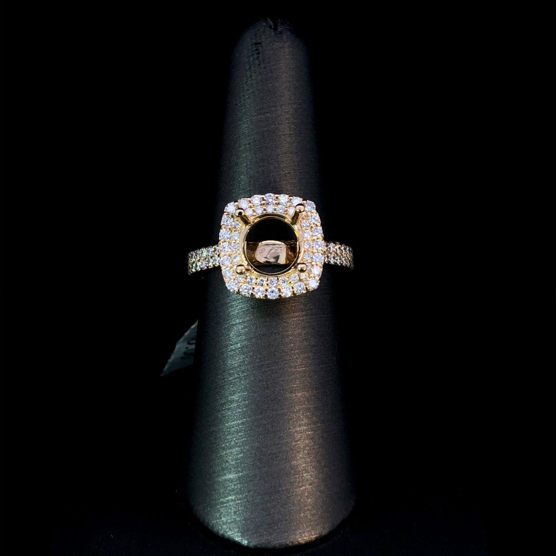 Indulge in luxury with our stunning diamond semi mount. Featuring a double halo and band, decorated with a total diamond weight of .74ctw set in 14kt yellow gold. Select your dream center stone from our vast inventory and illuminate from every angle. Make a statement with this exquisite piece. Price is for the semi mount only. Center stone will be added at an additional cost. This ring is a size 7. If that size is not a perfect fit, first time sizing is free at the time of purchase. Additional sizing fees may apply.
