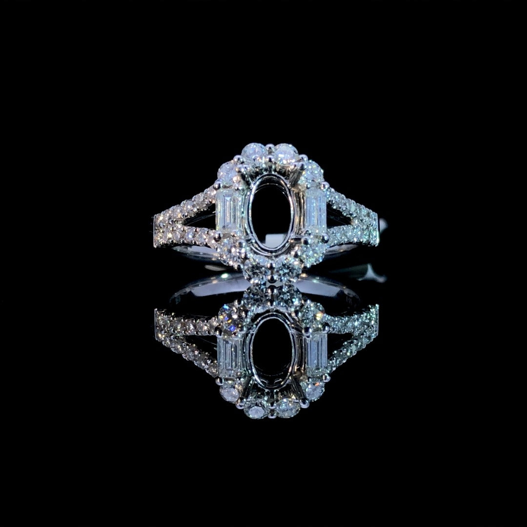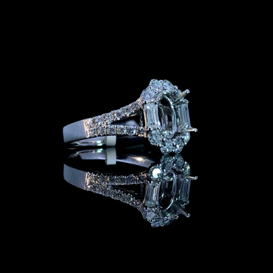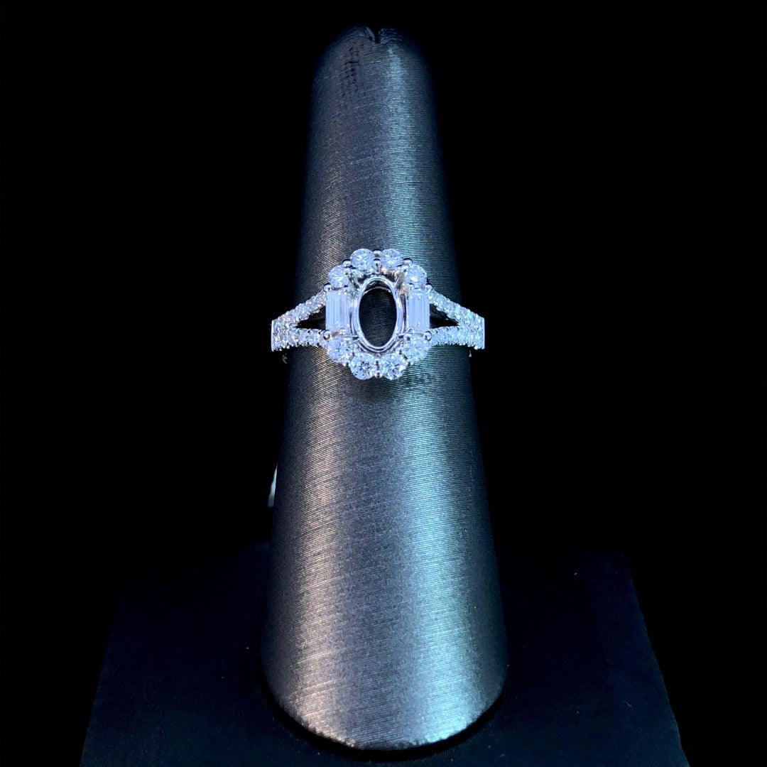 Capture timeless beauty with this luxe semi mount engagement ring. Crafted in luminous 14kt white gold, it is adorned with a sumptuous halo of round and baguette diamonds. An elegant split shank adds a final touch of sparkle, while offering an ideal setting for an exquisite oval-shaped center stone. With a total diamond weight of .84ctw, you will shine from all angles! Price is for the semi mount only. Center stone will be added at an additional cost. This ring is a size 6.5. If that size is not a perfect fit, first time sizing is free at the time of purchase. Additional sizing fees may apply.