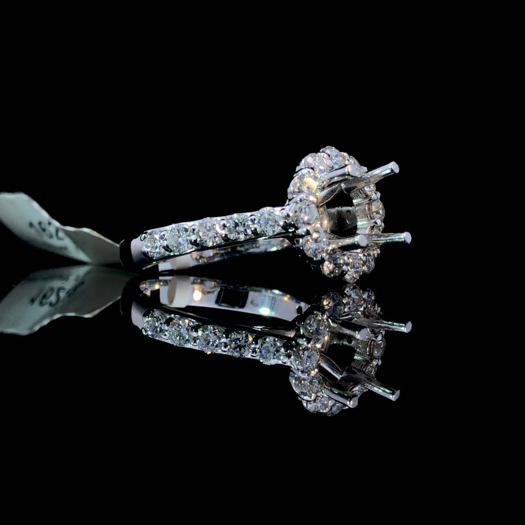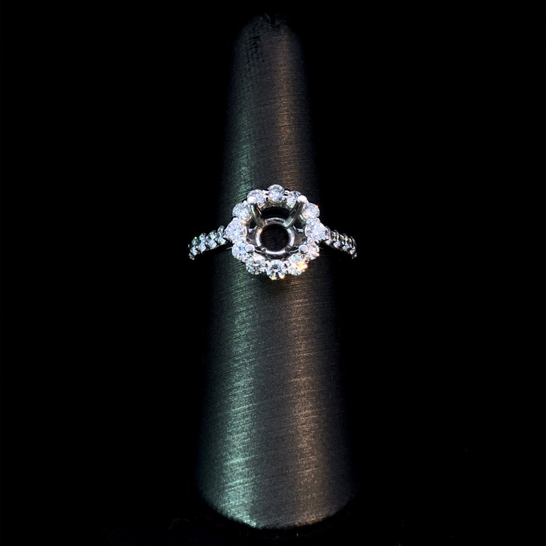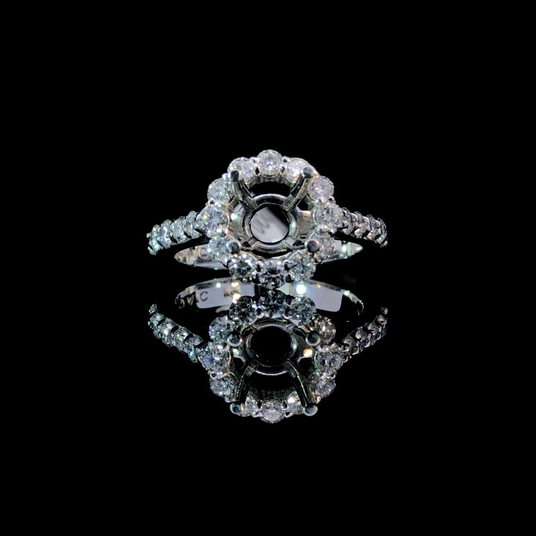 Indulge in luxury with this stunning diamond semi mount. Its round halo design and sparkling diamonds on the 14kt white gold band make it a timeless piece. With a total diamond weight of 1.10ctw, this ring will be cherished for generations. Personalize it with your choice of round center stone from our selection for a one-of-a-kind addition to your collection. Price is for the semi mount only. Center stone will be added at an additional cost. This ring is a size 7. If that size is not a perfect fit, first time sizing is free at the time of purchase. Additional sizing fees may apply.