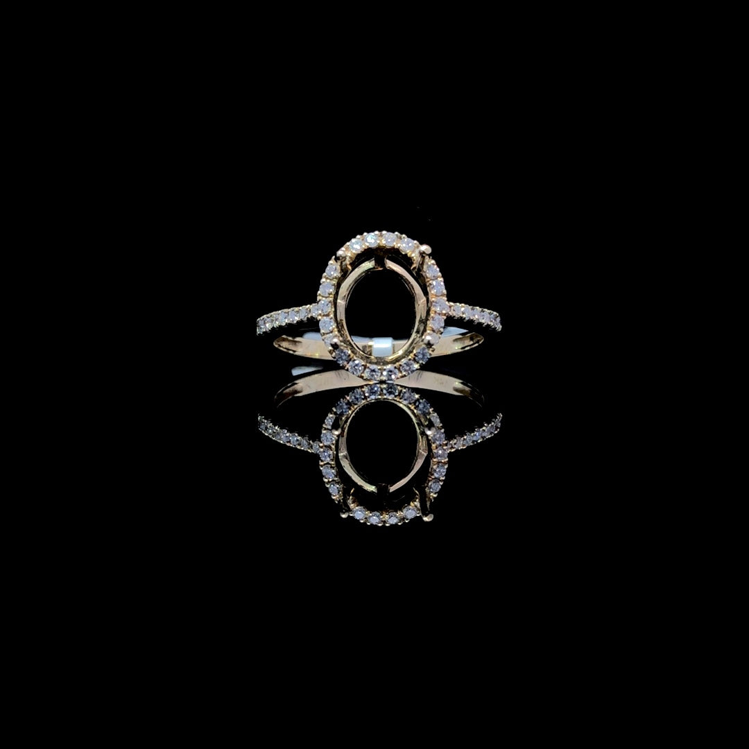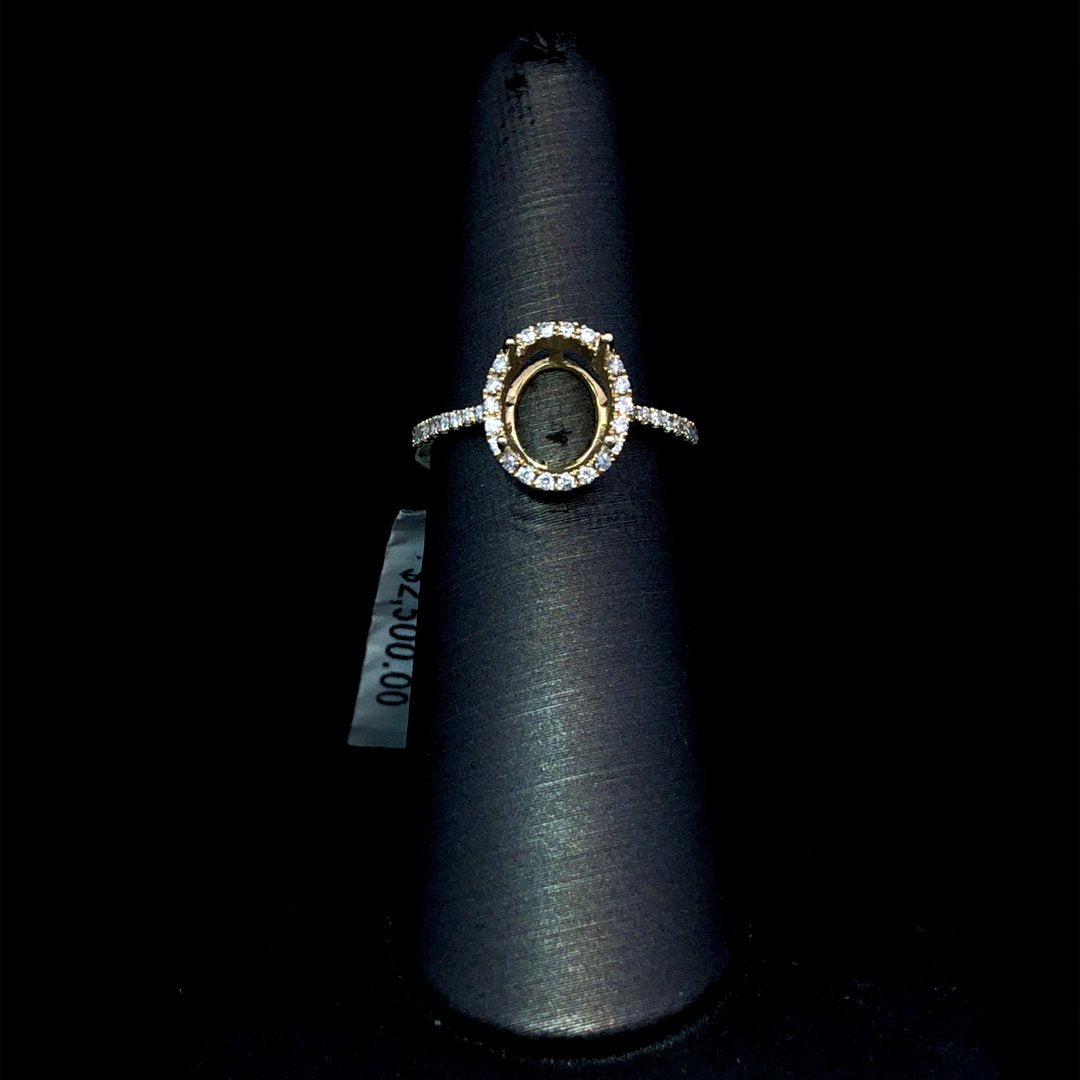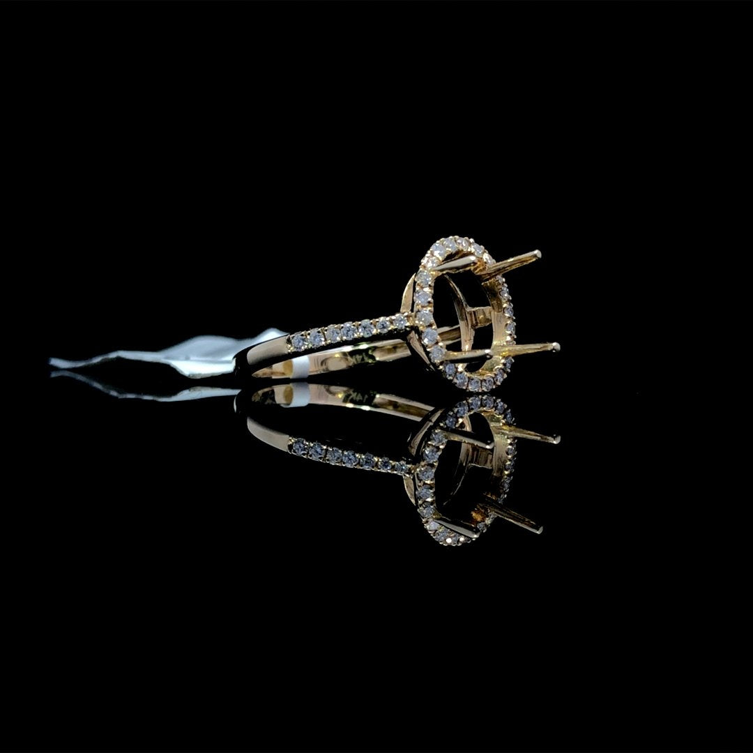 Create a dazzling look with this 14kt yellow gold diamond semi mount featuring an oval halo and diamonds down the band, totaling .22ctw. Select your perfect center stone from our wide variety of loose stones to add a personalized touch to this stunning piece. Price is for the semi mount only. Center stone will be added at an additional cost. This ring is a size 6. If that size is not a perfect fit, first time sizing is free at the time of purchase. Additional sizing fees may apply.