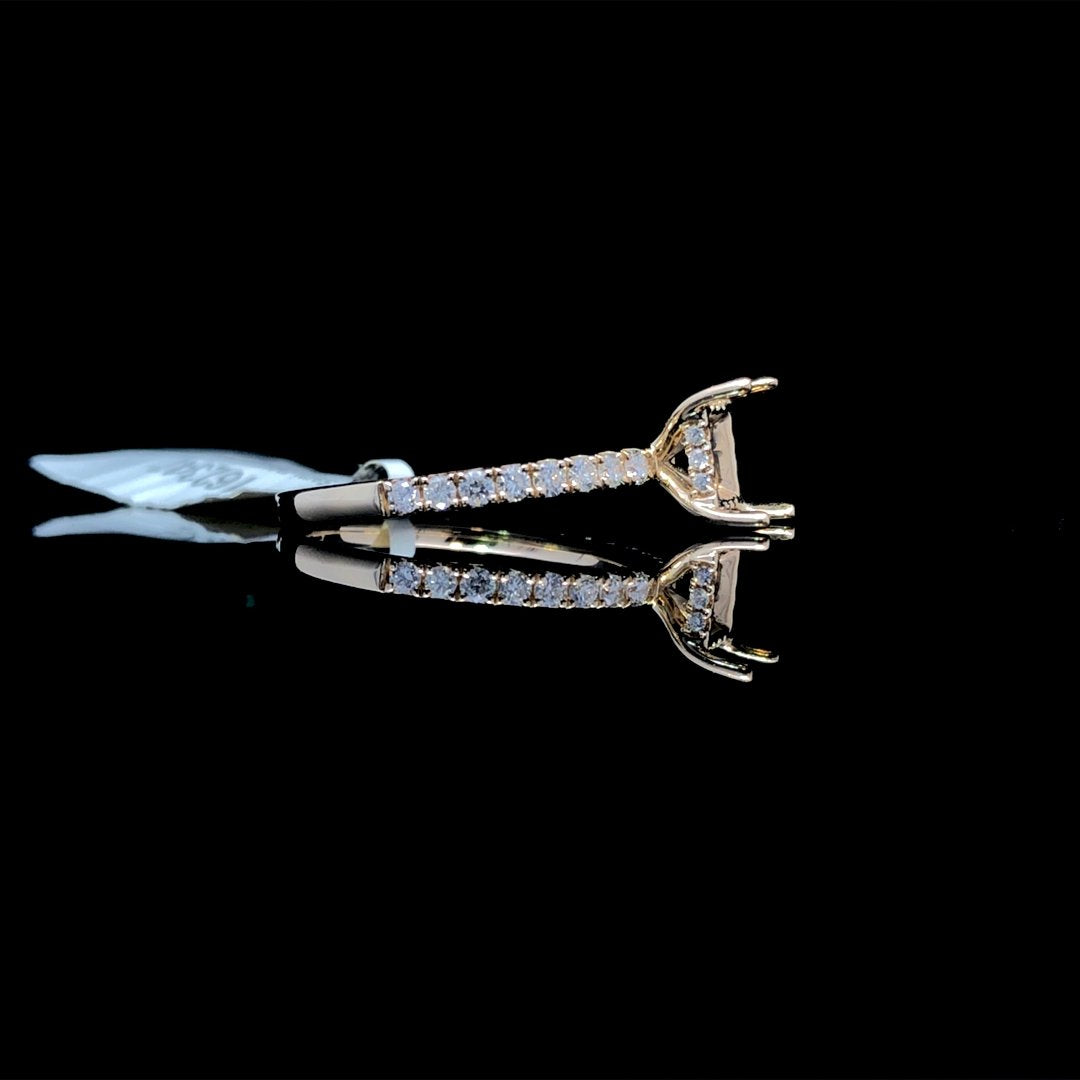 Create your dream engagement ring with this stunning 14kt yellow gold semi mount. Featuring a square shaped head with a hidden halo and cascading diamonds down the band, this piece offers a total diamond weight of .40ctw. Choose from our exquisite selection of princess cut stones to complete this beautiful piece. Price is for the semi mount only. Center stone will be added at an additional cost. This ring is a size 7.25. If that size is not a perfect fit, first time sizing is free at the time of purchase. Additional sizing fees may apply.