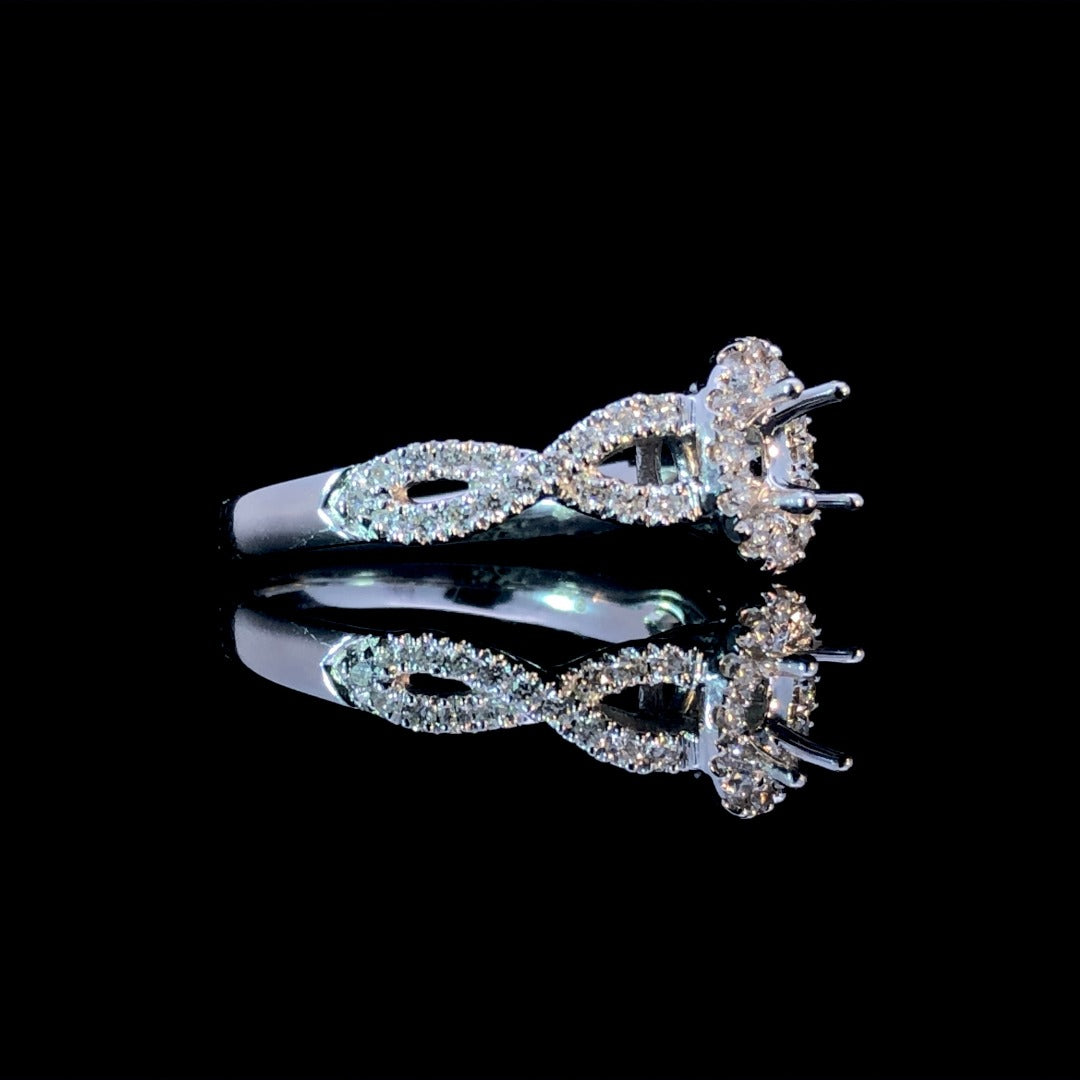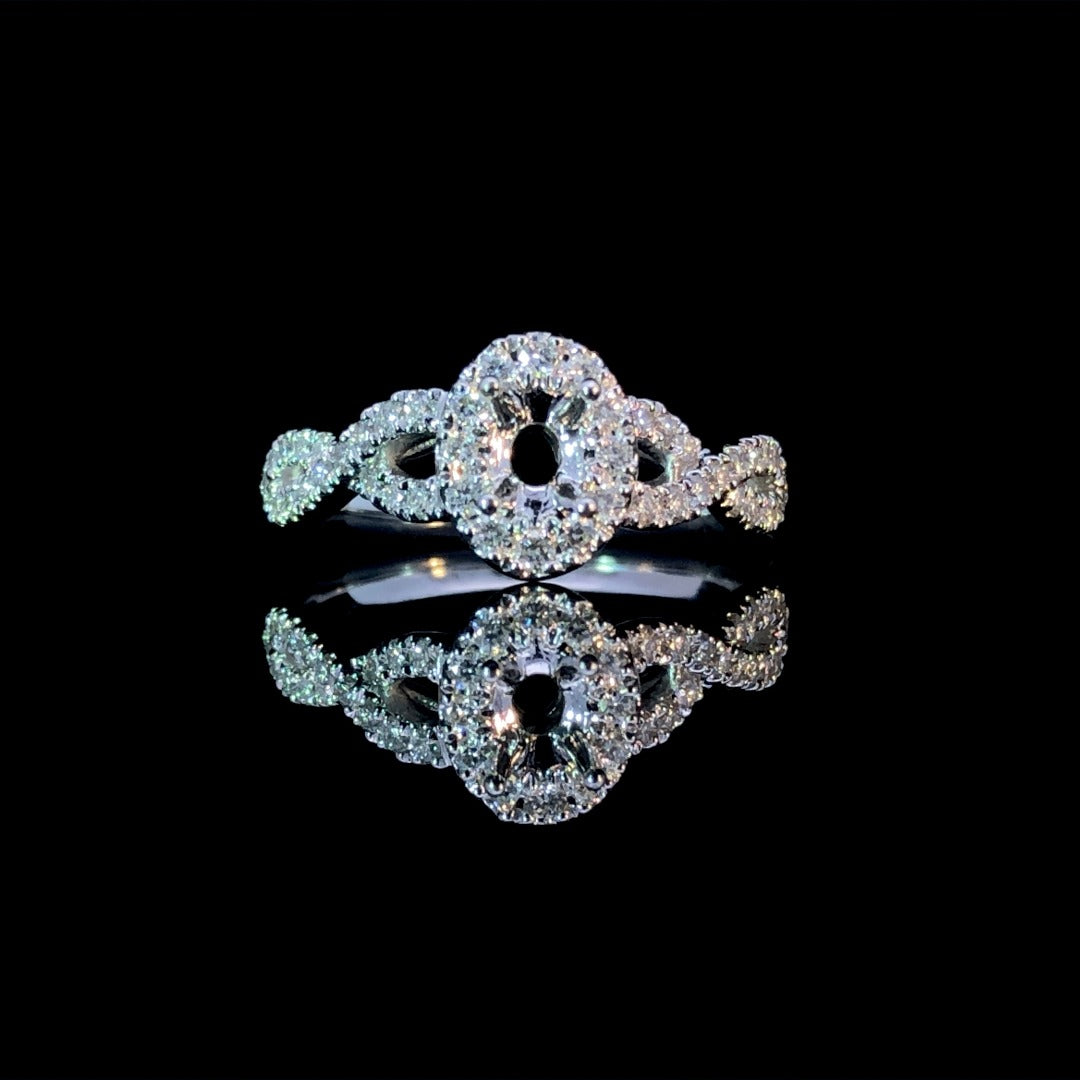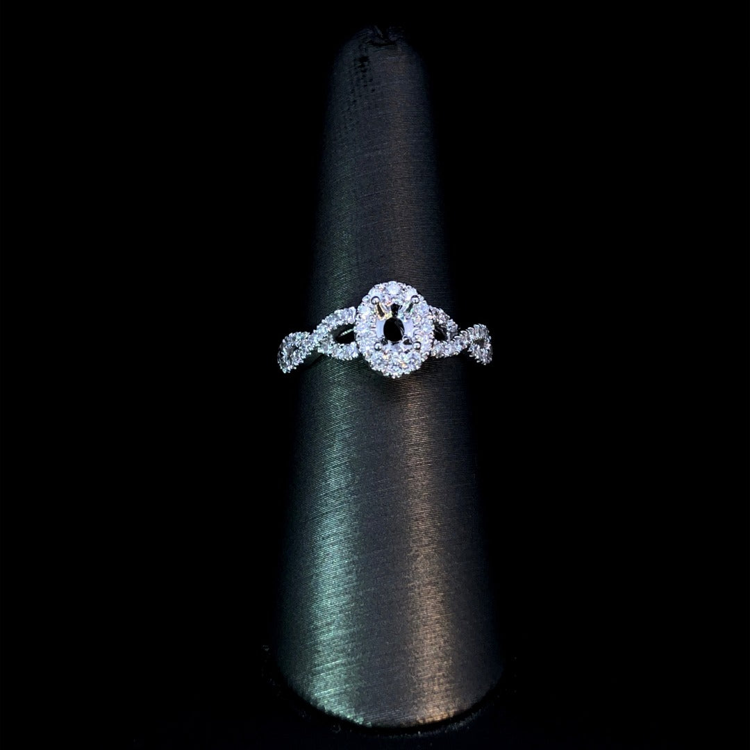Indulge in true luxury with our 14kt white gold semi mount featuring an oval halo surrounding a hand-picked loose stone of your choice from our unmatched selection. The twisted band, adorned with round diamonds, adds a touch of elegance to this stunning .42ctw piece. Make it truly yours with your own personal touch. Price is for the semi mount only. Center stone will be added at an additional cost. This ring is a size 7. If that size is not a perfect fit, first time sizing is free at the time of purchase. Additional sizing fees may apply.