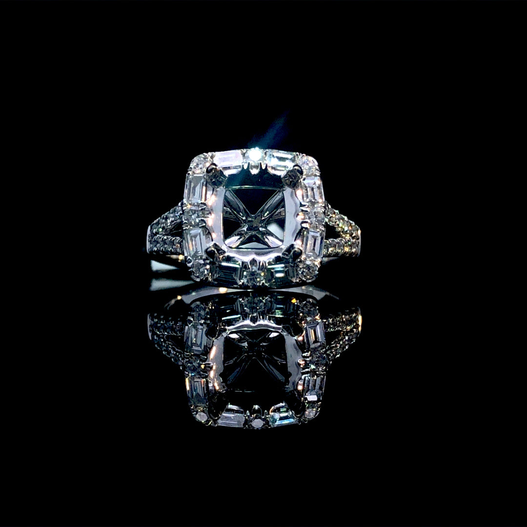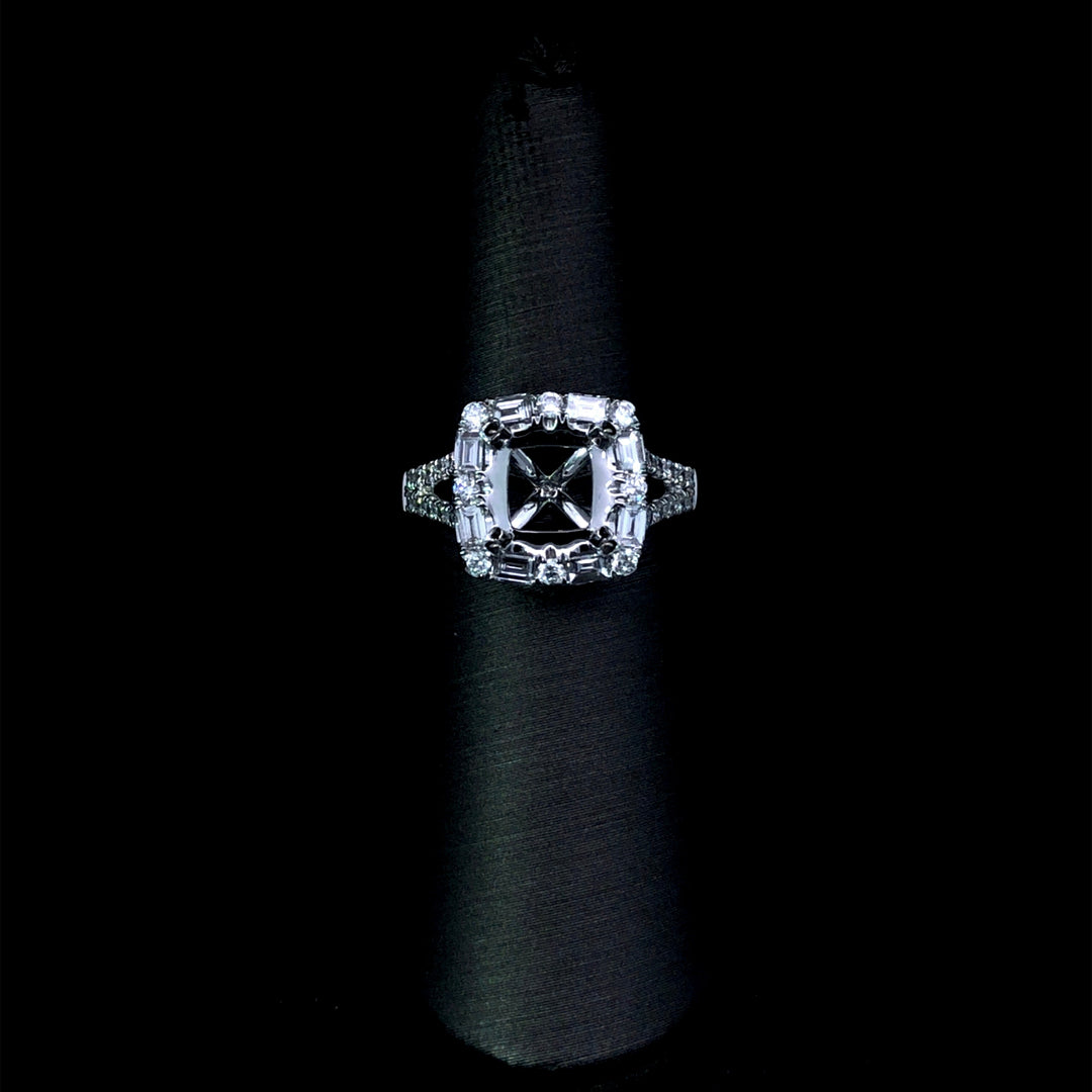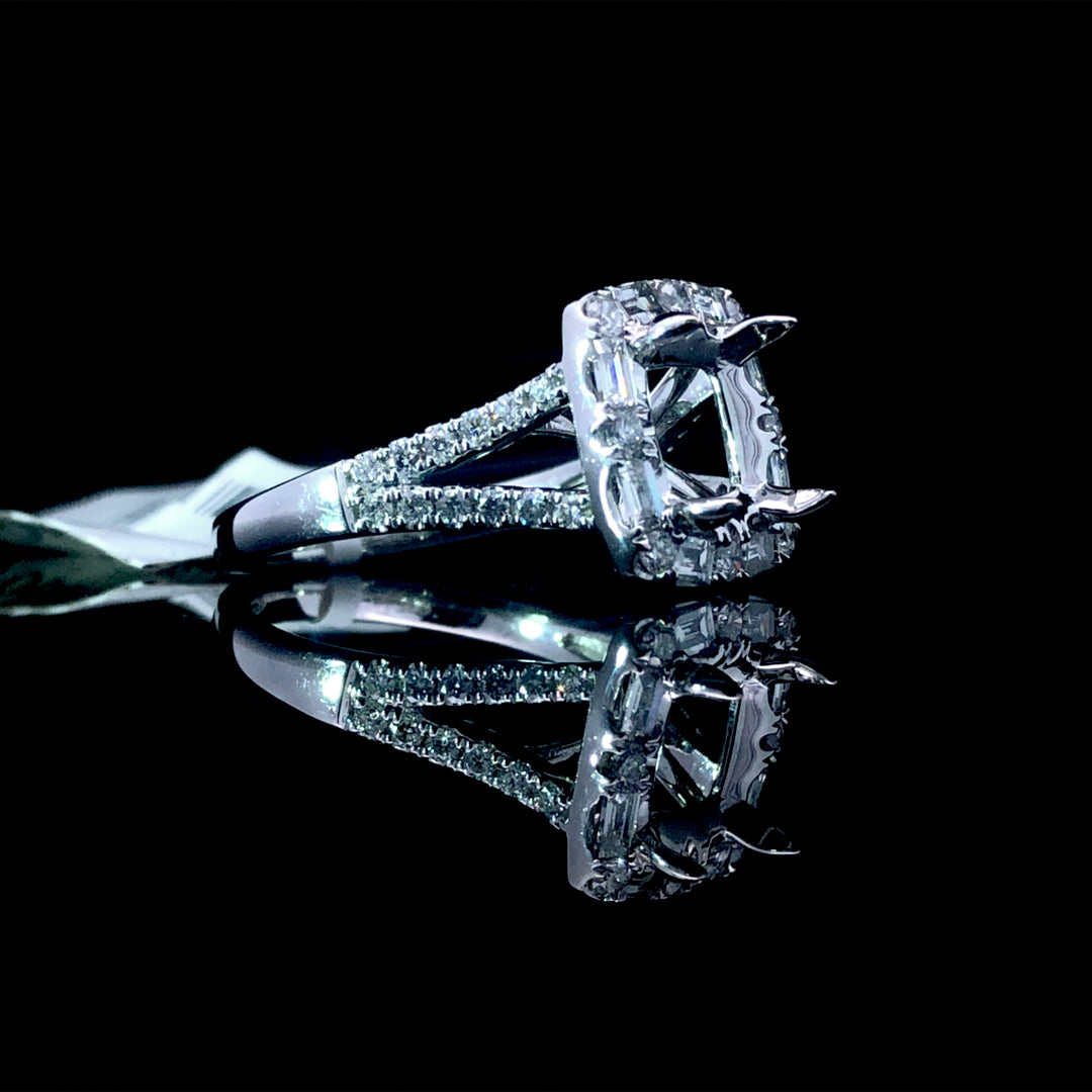 Create your dream engagement ring with this breathtaking diamond semi mount. The striking halo features a blend of round and baguette diamonds, while additional round diamonds cascade down the split shank for maximum brilliance. Set in 14kt white gold with .90ctw of diamonds, this semi mount provides the perfect foundation for your vision. Browse our extensive collection of loose stones to select the center diamond that speaks to your heart, then watch as your one-of-a-kind piece comes to life. Price is for the semi mount only. Center stone will be added at an additional cost. This ring is a size 7. If that size is not a perfect fit, first time sizing is free at the time of purchase. Additional sizing fees may apply.
