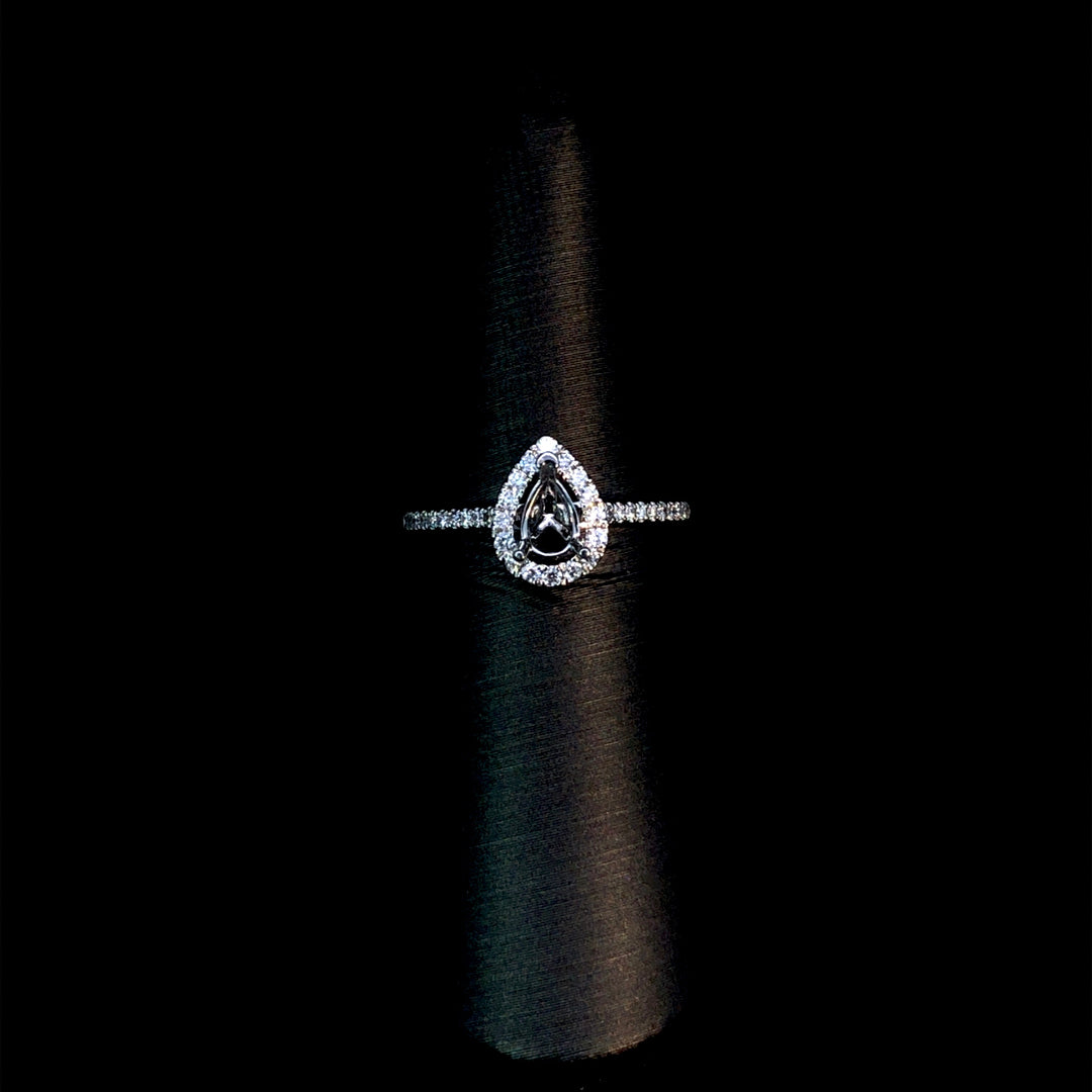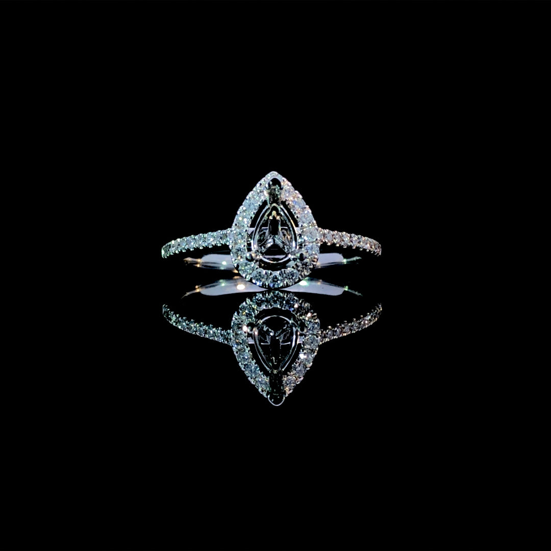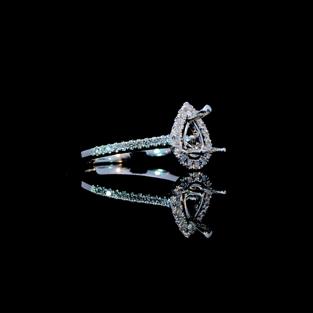 Create the engagement ring of your dreams with this semi mount. Featuring a pear-shaped halo and diamond accents along the band, this 18kt white gold setting showcases .29ctw of brilliant diamonds that complement the center stone of your choice. The thoughtful design allows you to handpick your perfect diamond or gemstone from our collection, giving you complete creative control. Build something meaningful that reflects your unique style and love story. Price is for the semi mount only. Center stone will be added at an additional cost. This ring is a size 6.25. If that size is not a perfect fit, first time sizing is free at the time of purchase. Additional sizing fees may apply.