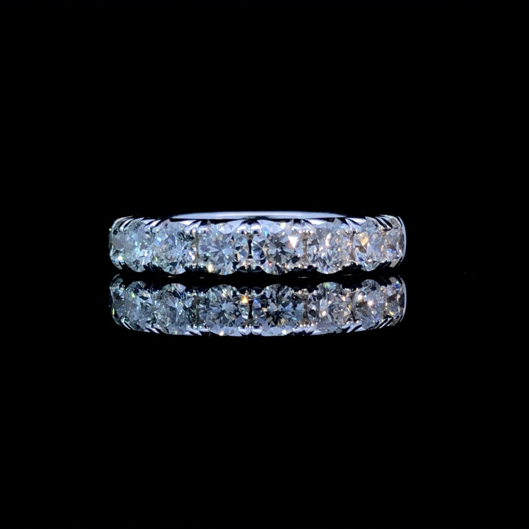 Our 1.80 ctw diamond band is a stunning representation of elegance and sparkle. Crafted from polished 18kt white gold, it features nine dazzling diamonds that will definitely draw attention. Perfect for special occasions or everyday wear, this timeless piece will have you shining all day long. This ring is a size 6.25. If that size is not a perfect fit, first time sizing is free at the time of purchase, Additional sizing fees may apply.