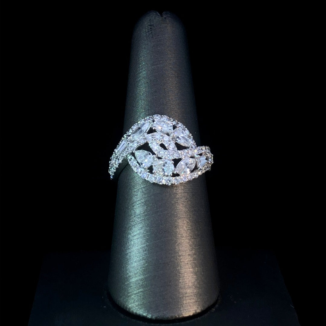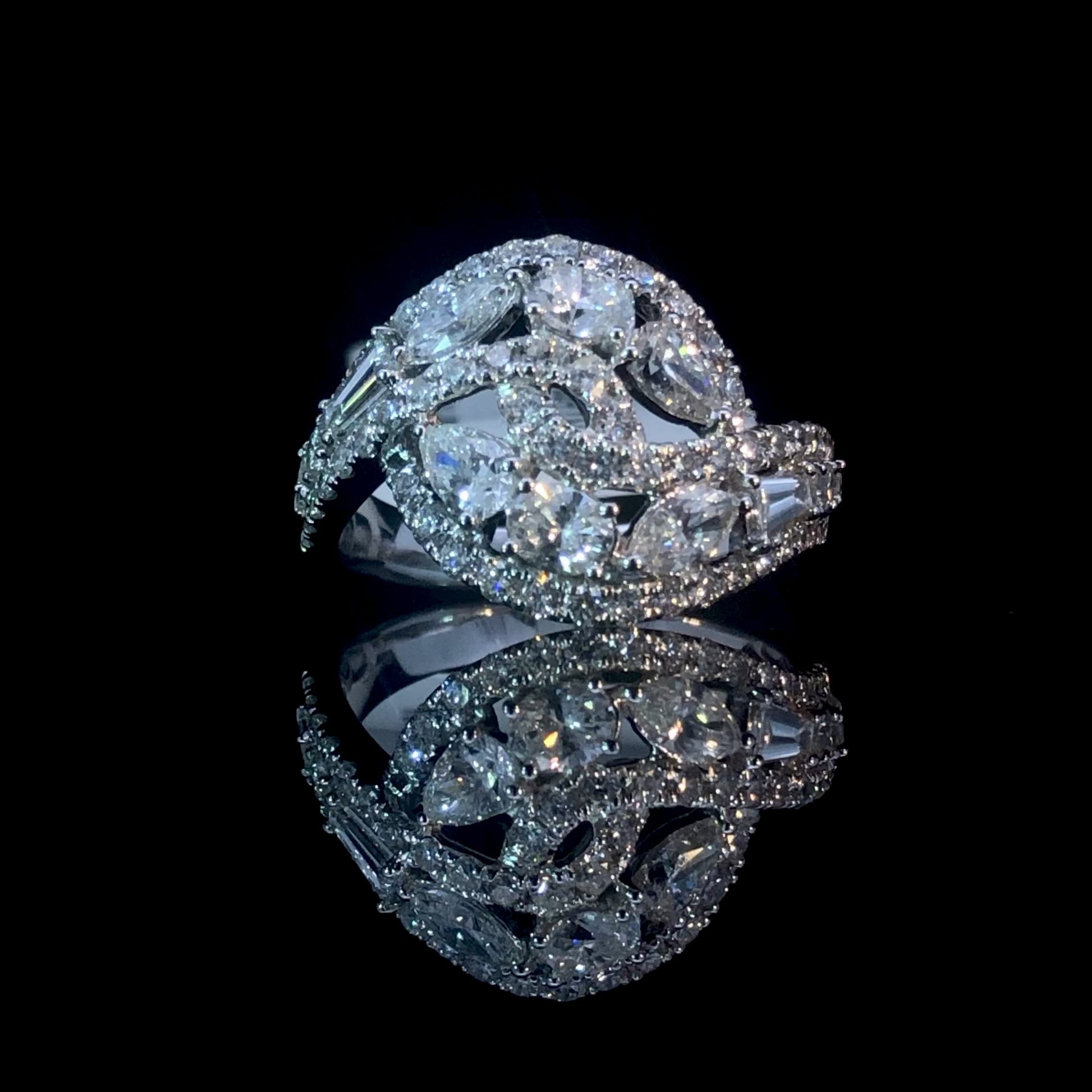 This unique, diamond-studded ring will make a stunning statement. Its complex design is crafted with 1.91ctw of round, marquise, oval, and pear shape diamonds set in 14kt white gold for a timeless look. Adorn your finger with luxurious class and beauty! This ring is a size 7.5. If that size is not a perfect fit, first time sizing is free at the time of purchase. Additional sizing fees may apply.
