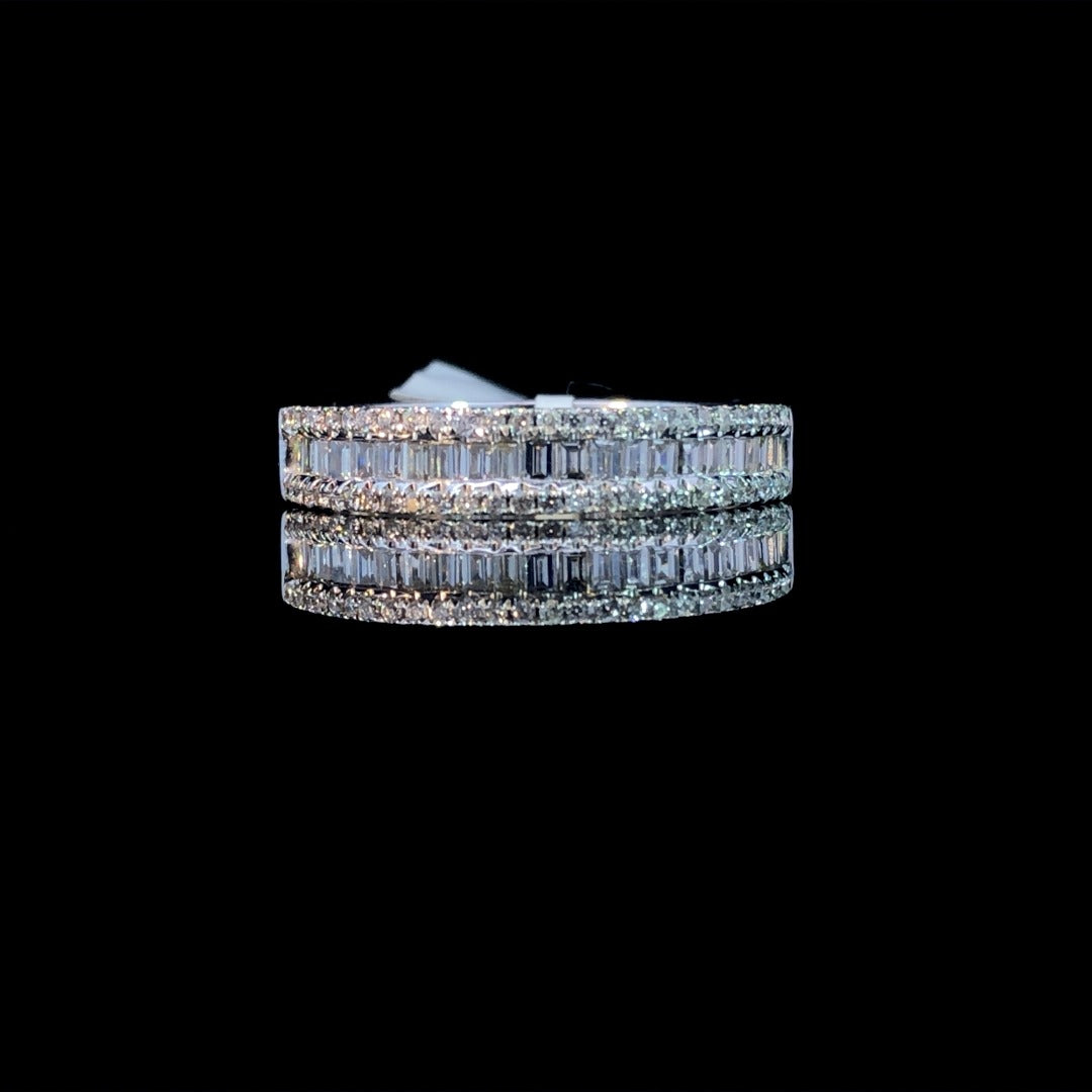 Indulge in luxury with our exquisite diamond band. The center boasts stunning baguette diamonds, while round diamonds adorn the outer edges for a total diamond weight of .59ctw. Crafted in 14kt white gold, this band radiates elegance and sophistication. This ring is a size 7. If that size is not a perfect fit, first time sizing is free at the time of purchase. Additional sizing fees may apply.