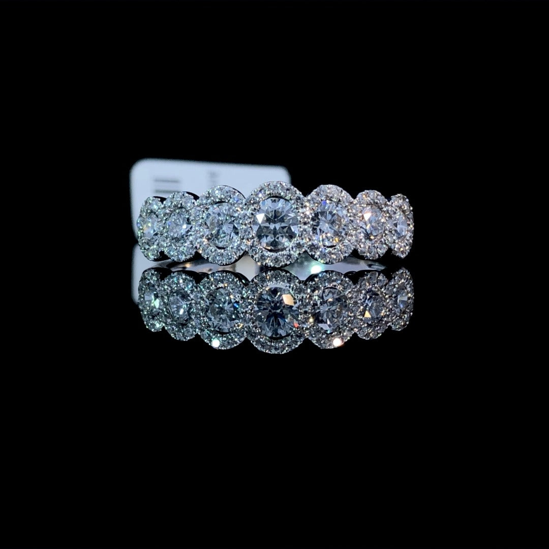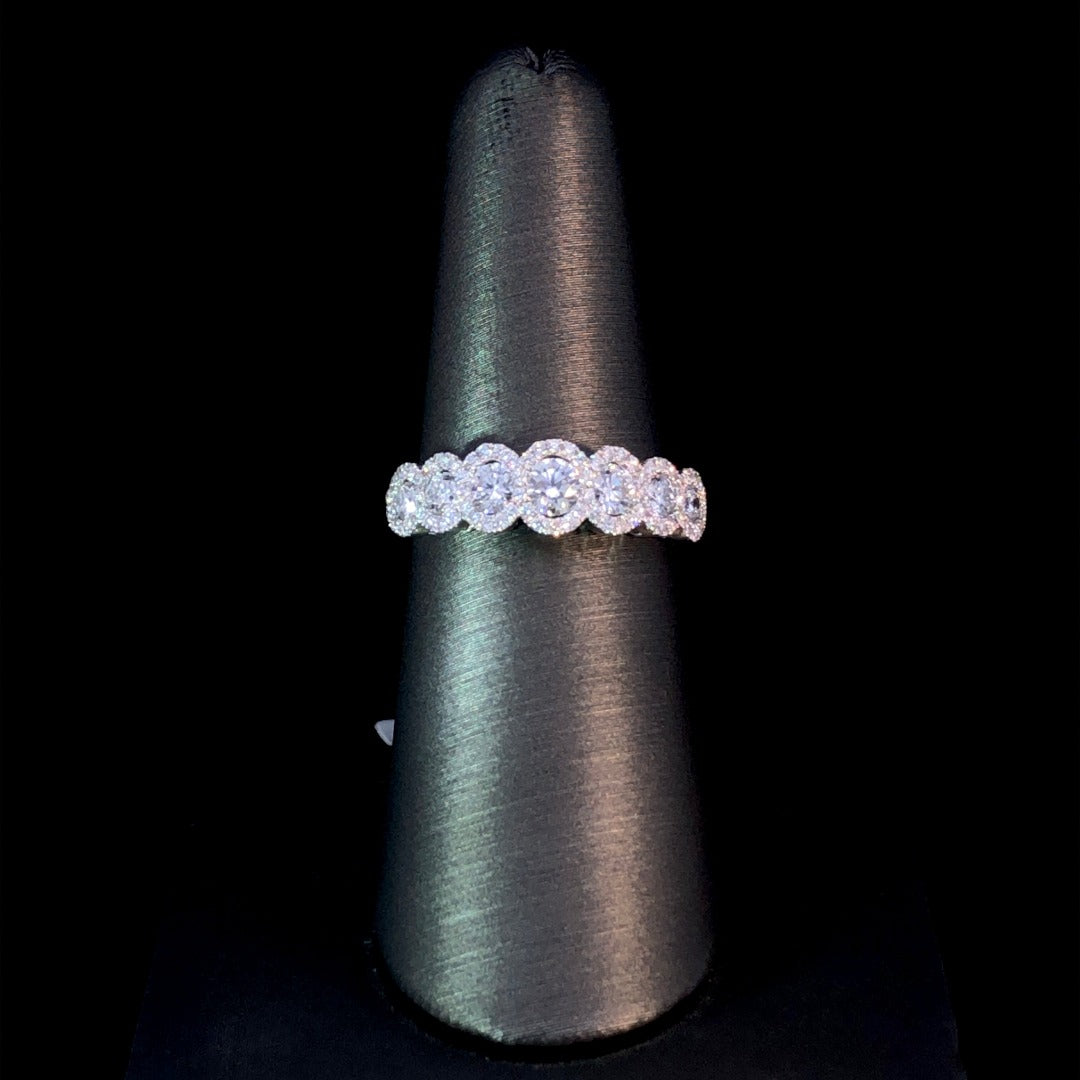 Experience sophistication and exclusivity with this exquisite diamond band. Crafted from 14kt white gold, it showcases one carat of round diamonds encircled by a radiant halo of additional diamonds, creating a luxurious look that will make you shine. This ring is a size 7. If that size is not a perfect fit, first time sizing is free at the time of purchase. Additional sizing fees may apply.