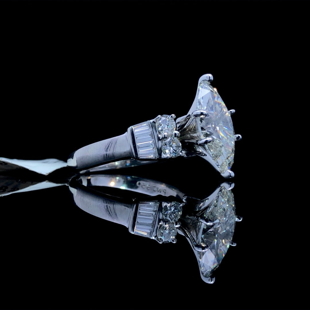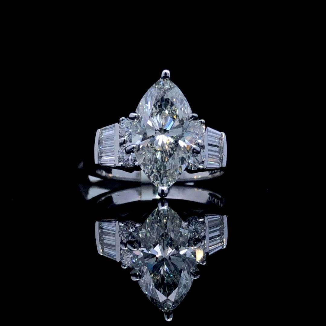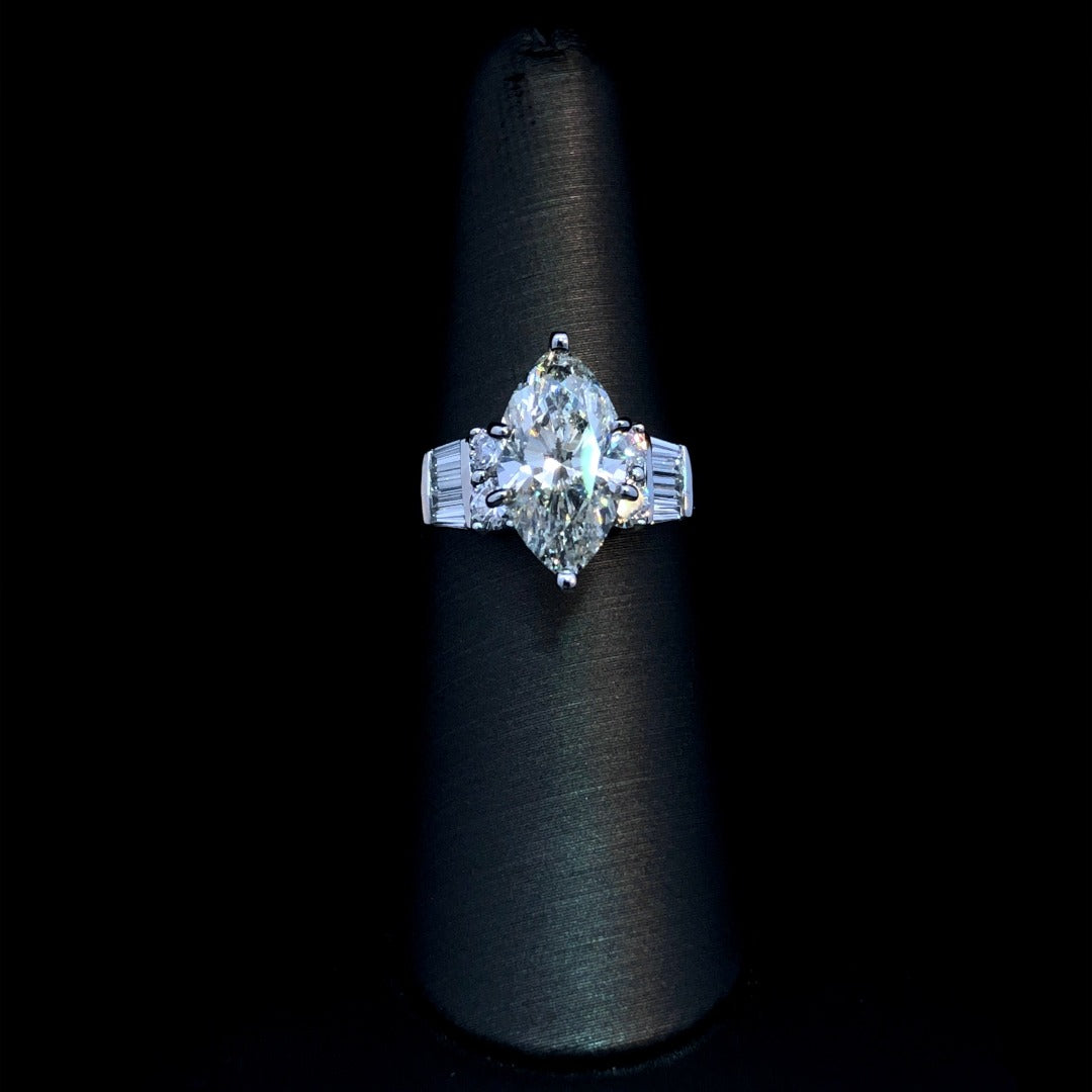 Introducing the ultimate statement piece. Exquisitely crafted in platinum, this ring boasts a breathtaking 3.13ct marquise diamond as its centerpiece, accented by .75ctw of round and baguette diamonds. Elevate any occasion with this stunning and exclusive piece. This ring is a size 7. If that size is not a perfect fit, first time sizing is free at the time of purchase. Additional sizing fees may apply.