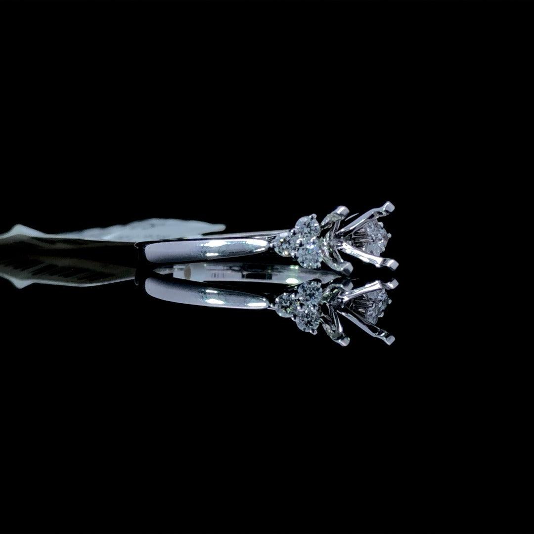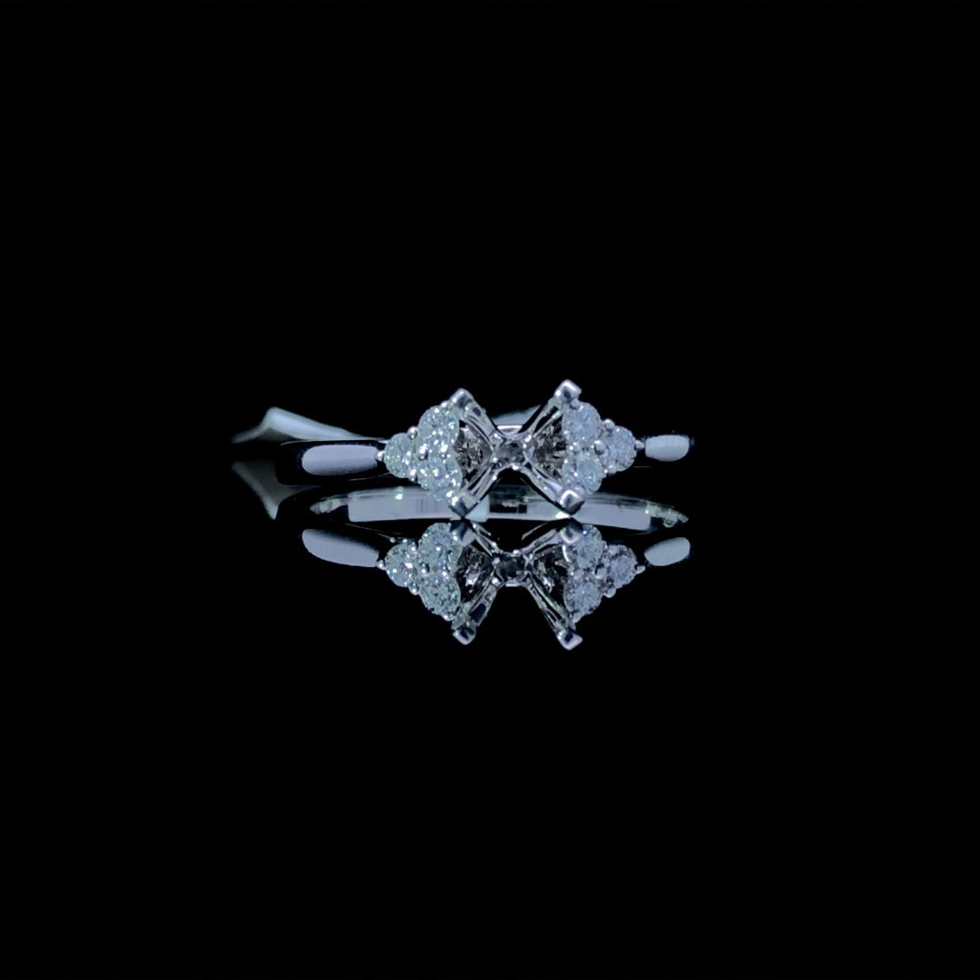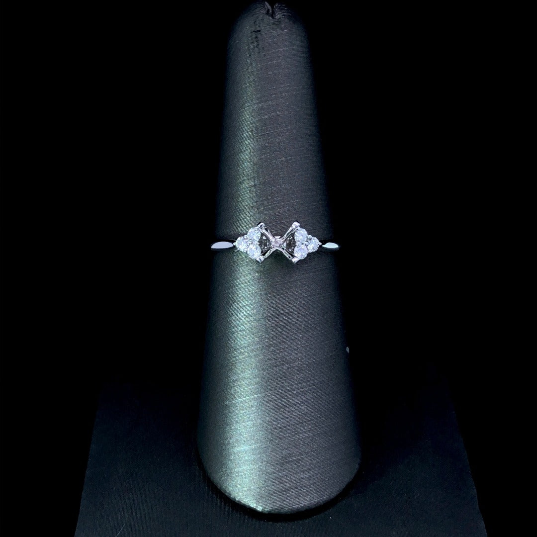 Create a timeless look with this classic semi mount. The 14kt white gold band is adorned with .14ctw of round diamond side stones arranged in a striking trillion shape. Choose your perfect center stone from our wide selection of loose stones to make this piece truly yours. Price is for the semi mount only. Center stone will be added at an additional cost. This ring is a size 7. If that size is not a perfect fit, first time sizing is free at the time of purchase. Additional sizing fees may apply.
