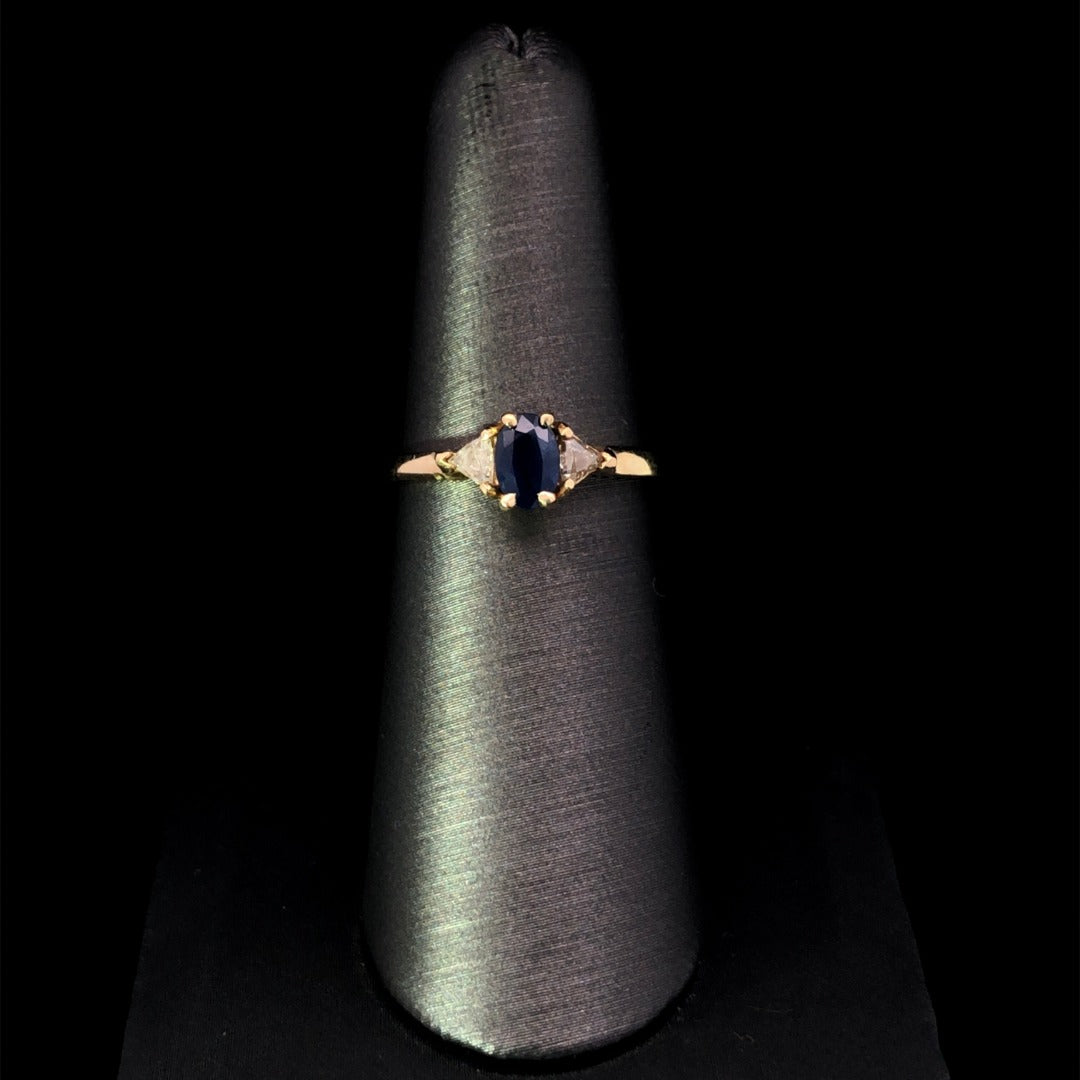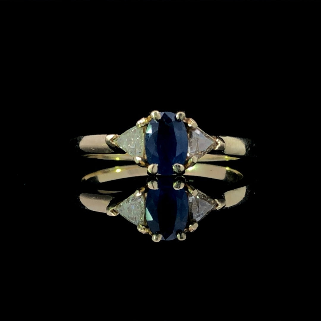 This luxurious 14kt yellow gold ring is graced with a stunning .45ct oval sapphire in the center, drawing the eye in. Enhancing the breathtaking design, two matching trillion cut diamonds totaling .20ctw glimmer invitingly at the sides. A truly exquisite piece for the most discerning jewelry connoisseur. This ring is a size 6.25. If that size is not a perfect fit, first time sizing is free at the time of purchase. Additional sizing fees may apply.