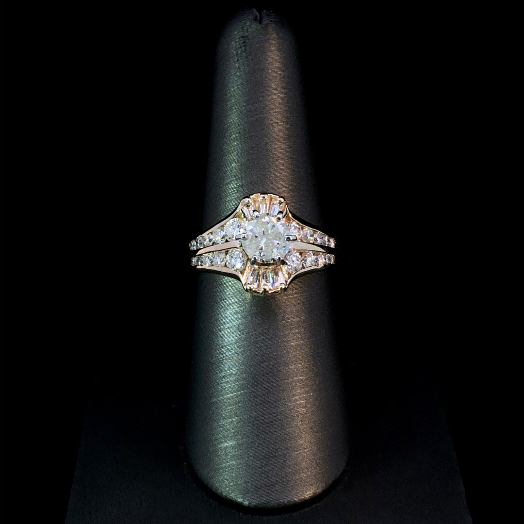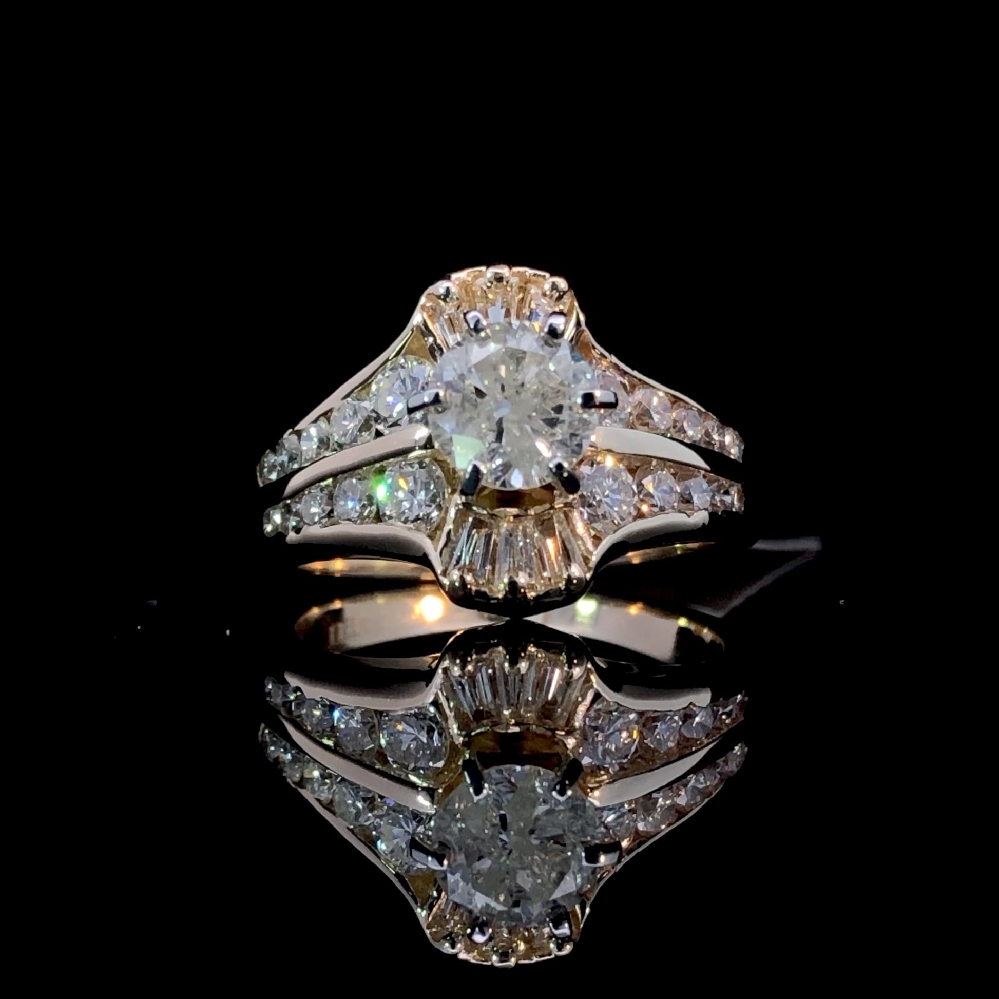 This unique and luxurious diamond ring is exquisitely crafted in 1.17 ctw lustrous 14 kt yellow gold semi mount, showcasing a brilliant 1.03 ct round diamond at the center. Radiant baguette diamonds draw the eye to the center diamond, while additional diamonds line the split-style band, creating a stunning silhouette. Perfect as a timeless symbol of love and commitment. This ring is a size 7.25. If that size is not a perfect fit, first time sizing is free at the time of purchase. Additional sizing fees may apply.