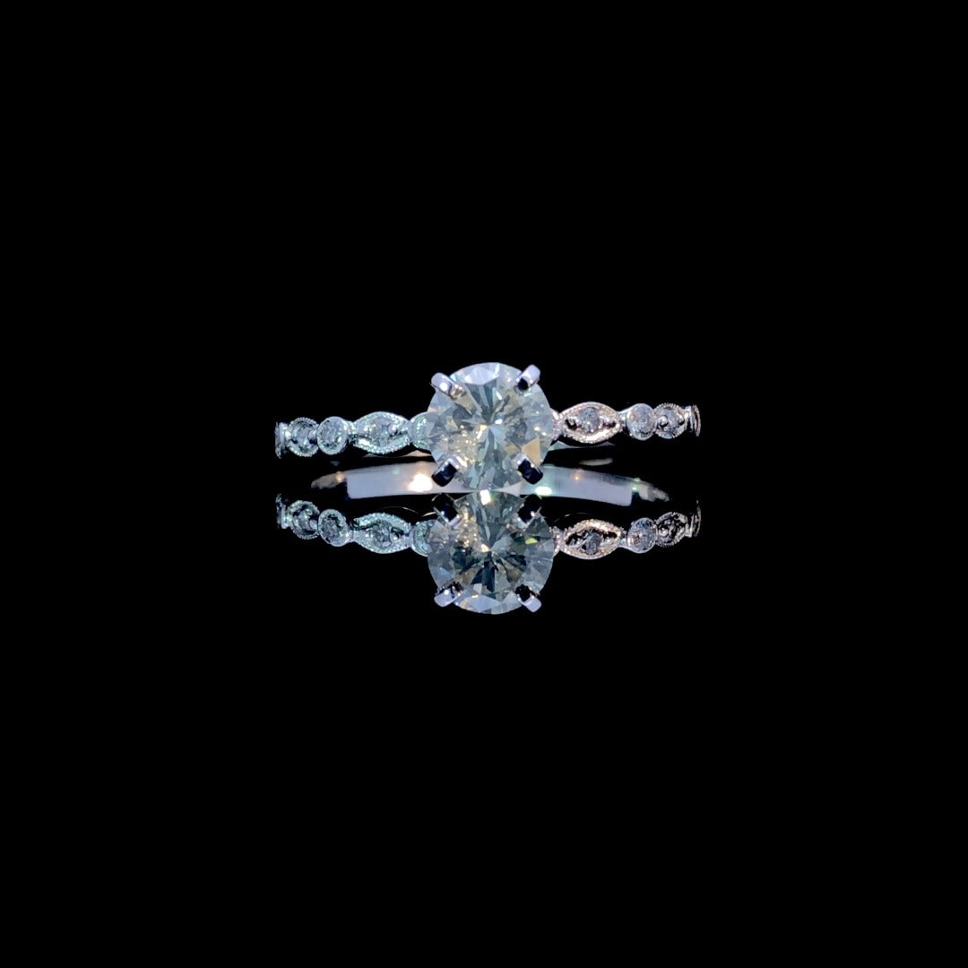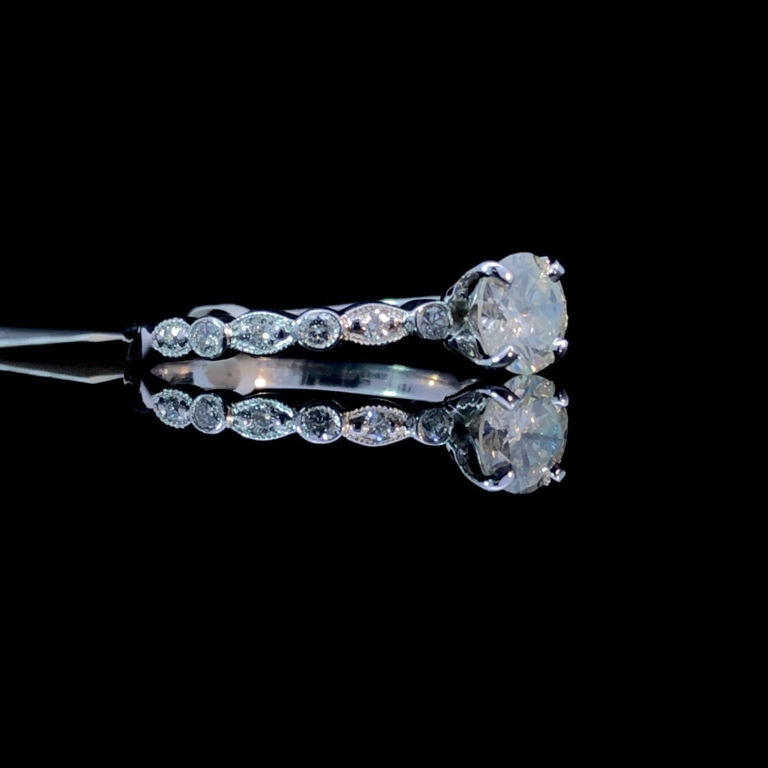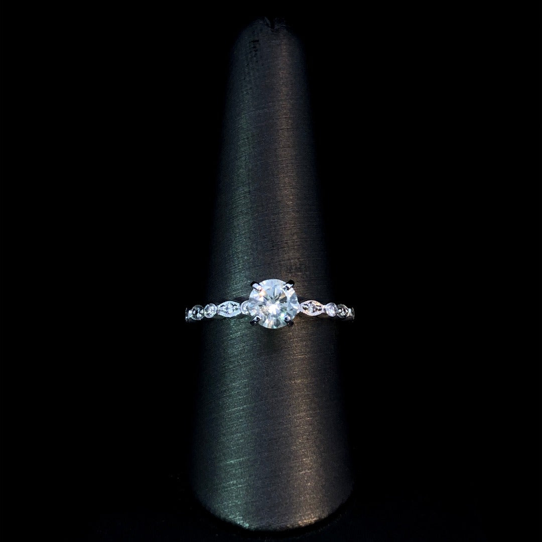 Indulge in luxury with this elegant 14kt white gold ring featuring a dazzling .74ct round center stone and a decorative band adorned with .10ctw of round diamonds. The unique design and total carat weight of .84ctw make for a stunning and sophisticated piece. This ring is a size 9. If that size is not a perfect fit, first time sizing is free at the time of purchase. Additional sizing fees may apply.