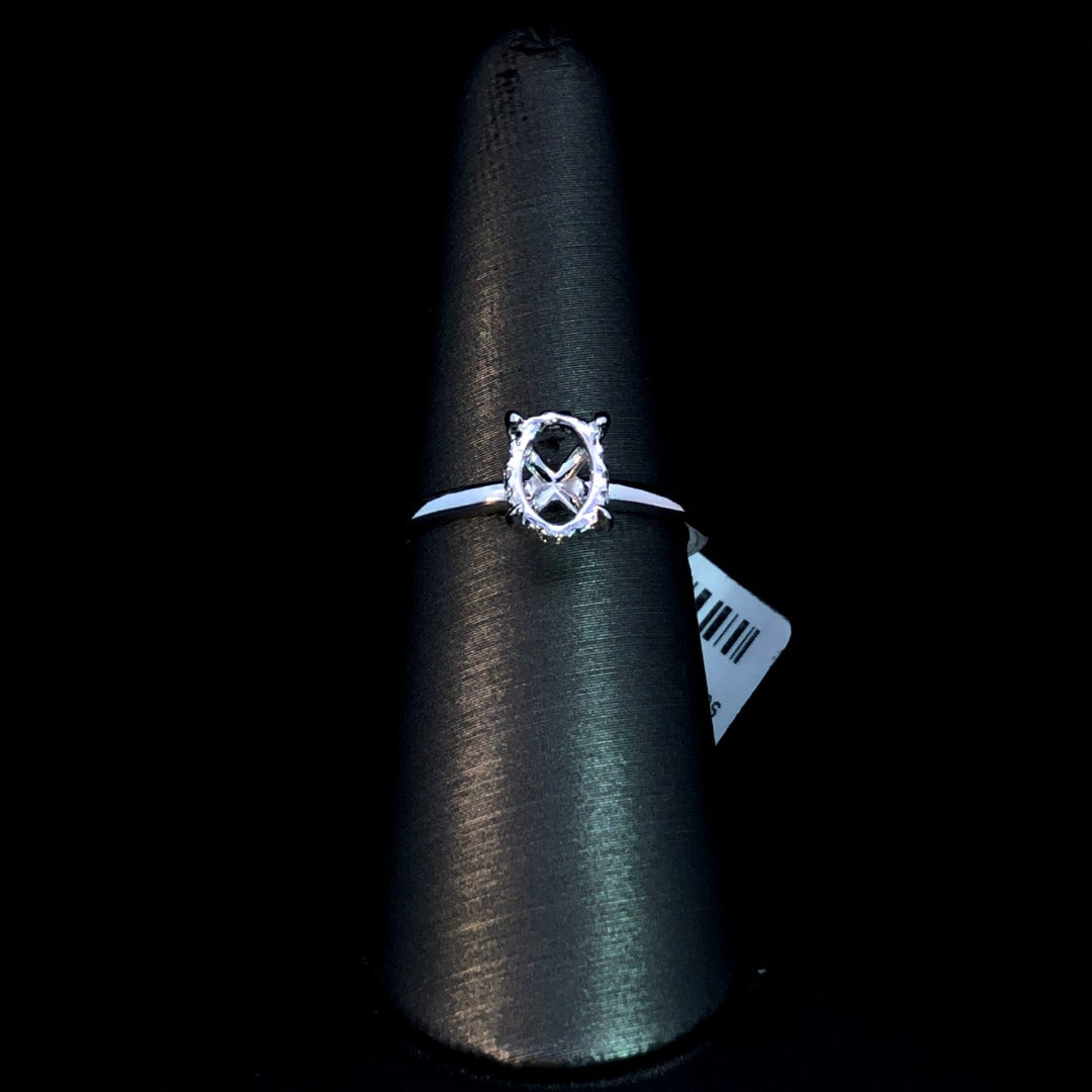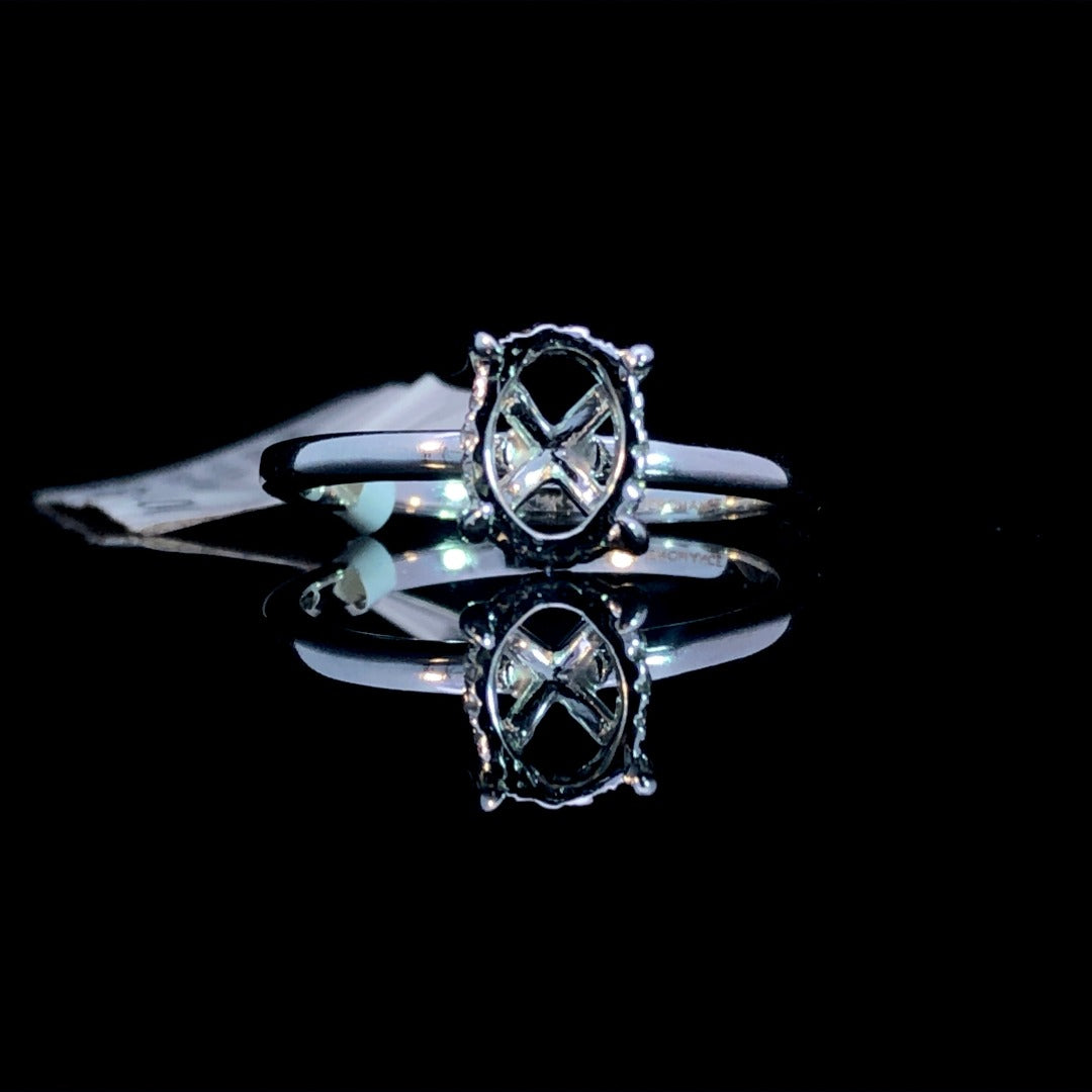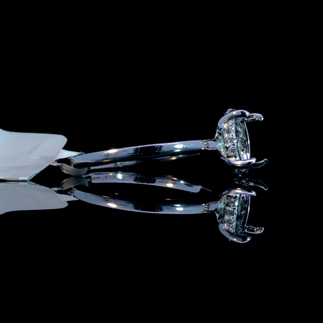 Create your dream ring with this chic diamond semi mount! This stunning piece features a hidden halo and space for an oval center stone of your choice. Made with 14kt white gold and .06ctw, it's the perfect setting for your perfect diamond. Price is for the semi mount only. Center stone will be added at an additional cost. This ring is a size 7. If that size is not a perfect fit, first time sizing is free at the time of purchase. Additional sizing fees may apply.