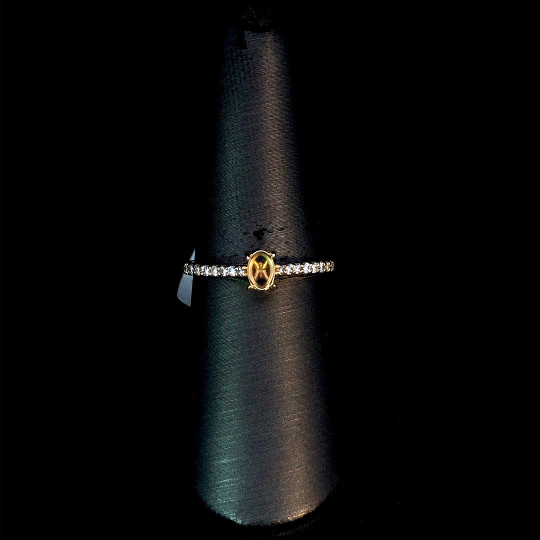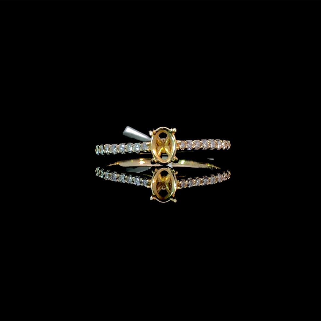This 14kt yellow gold diamond semi-mount offers a timeless and elegant design that complements any style. Delicate round diamonds cascade down the band, while subtle peek-a-boo diamonds beneath the head add a unique touch, bringing the total carat weight to 0.20ctw. Personalize your ring by selecting your favorite oval stone from our loose stone collection to create a truly special piece that reflects your individual taste. Price is for the semi mount only. Center stone will be added at an additional cost. This ring is a size 7. If that size is not a perfect fit, first time sizing is free at the time of purchase. Additional sizing fees may apply.