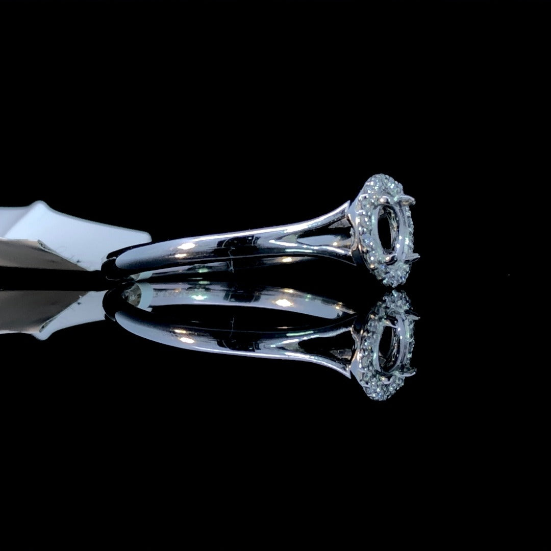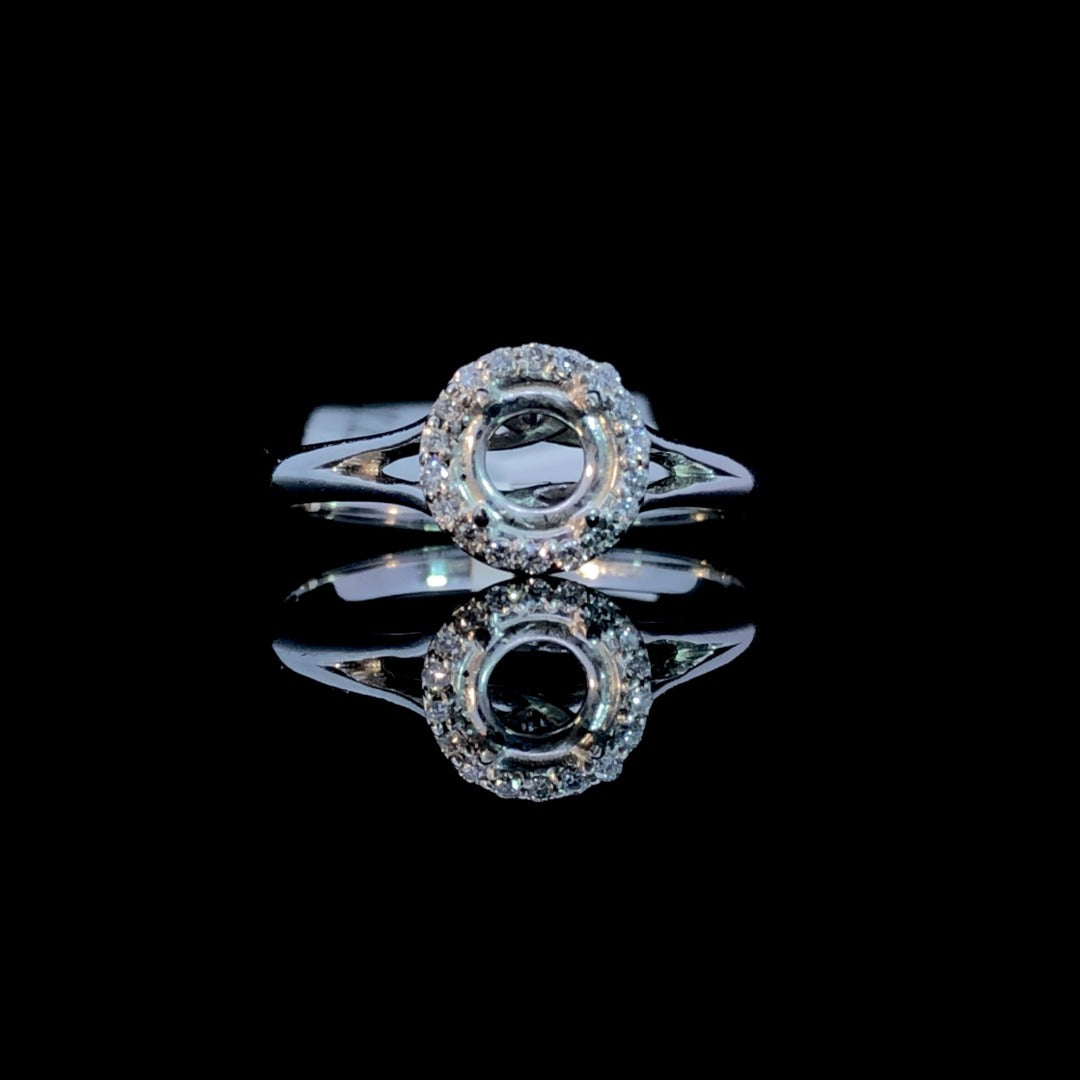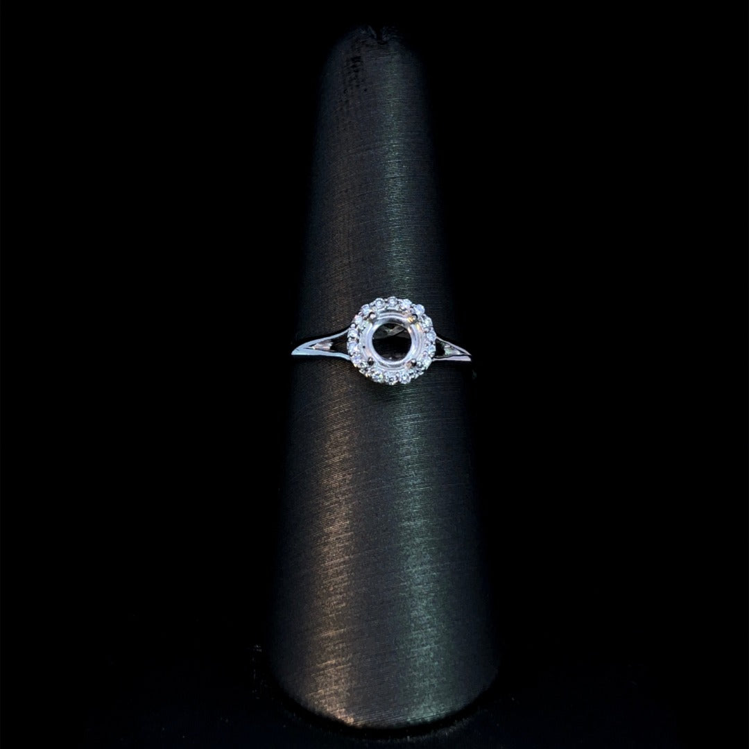 Indulge in luxury with this .09 ctw diamond semi mount ring. Its round diamond halo and 14kt white gold band create an exquisite base for your choice of center stone from our unmatched selection. Make a statement with this timeless and elegant piece. Price is for the semi mount only. Center stone will be added at an additional cost. This ring is a size 7. If that size is not a perfect fit, first time sizing is free at the time of purchase. Additional sizing fees may apply.
