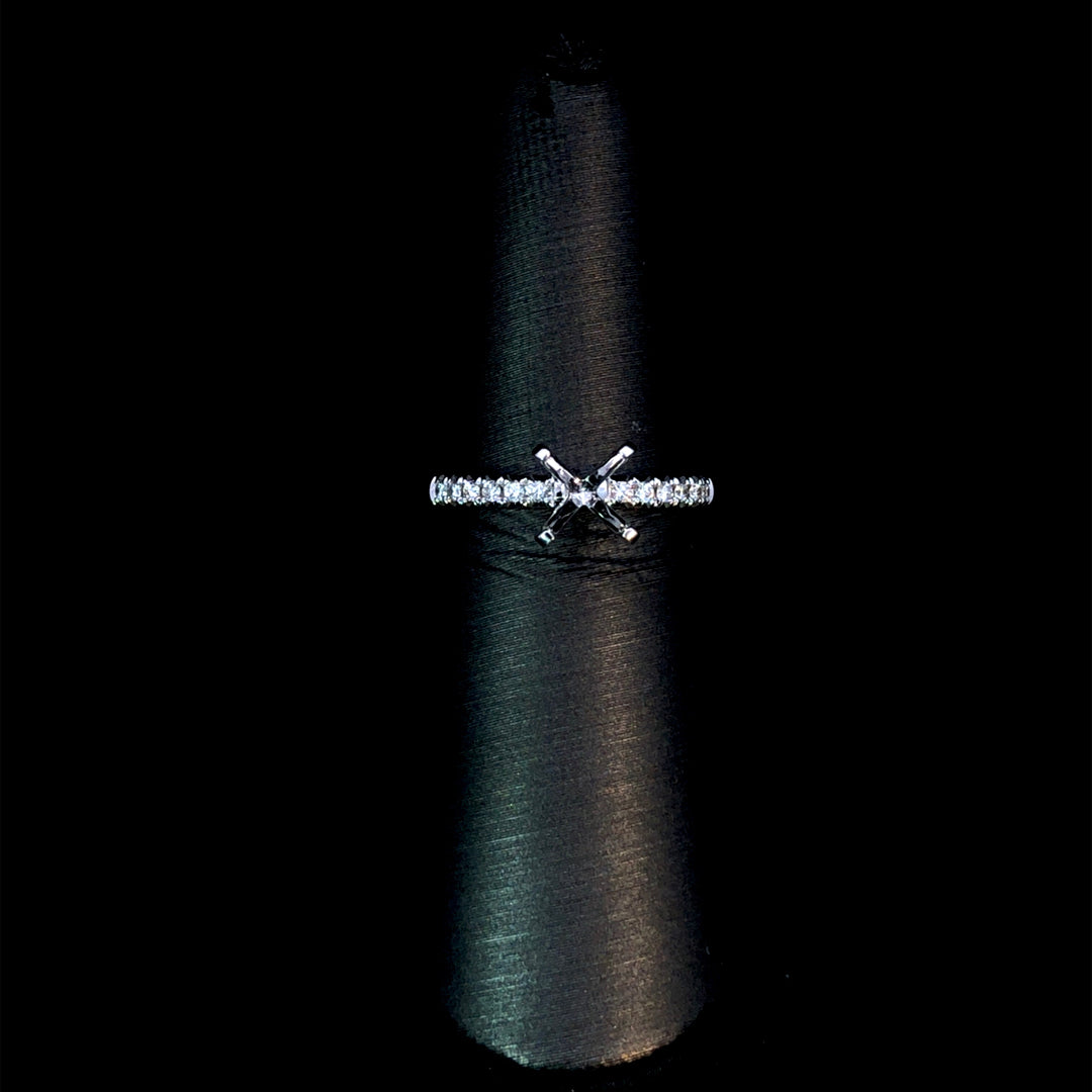 This timeless diamond semi-mount features .14ctw of round diamonds that gracefully cascade down the 14kt white gold band. Designed to hold any size or shape center stone, you can personalize your engagement ring by selecting the perfect stone from our extensive collection of loose stones. Create a piece that truly reflects your unique style and love story. Price is for the semi mount only. Center stone will be added at an additional cost. This ring is a size 6.25. If that size is not a perfect fit, first time sizing is free at the time of purchase. Additional sizing fees may apply.