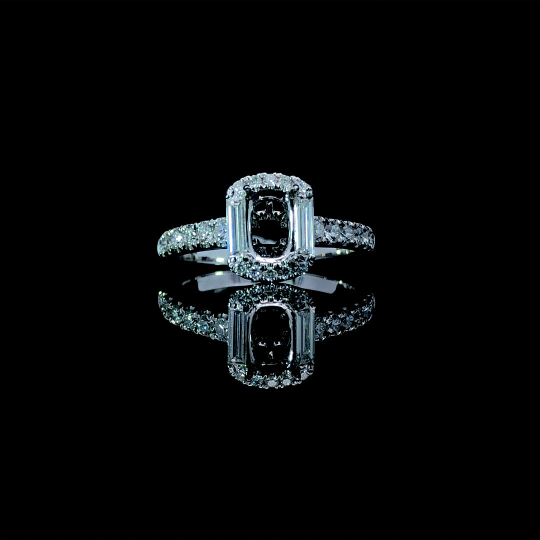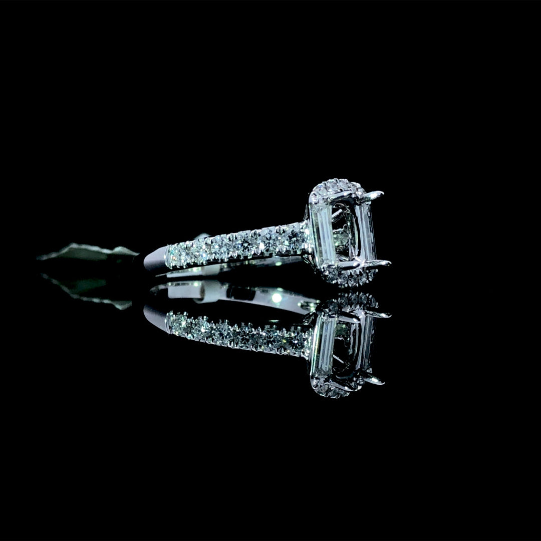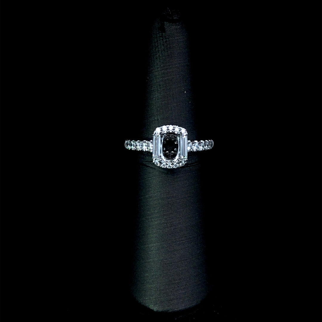 Elevate your engagement with this exquisite diamond semi mount, thoughtfully designed to showcase your chosen center stone. The piece features a radiant diamond halo combining round and baguette diamonds, with additional round diamonds gracefully cascading down the band. Set in lustrous 14kt white gold, this semi mount carries .63ctw of diamonds, creating a sophisticated and impressive look. Complete your dream ring by selecting your perfect center stone from our curated collection of loose diamonds. Price is for the semi mount only. Center stone will be added at an additional cost. This ring is a size6.25. If that size is not a perfect fit, first time sizing is free at the time of purchase. Additional sizing fees may apply.