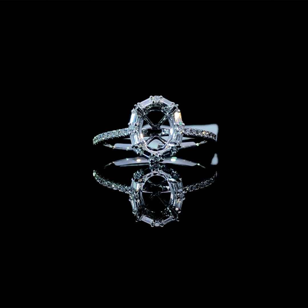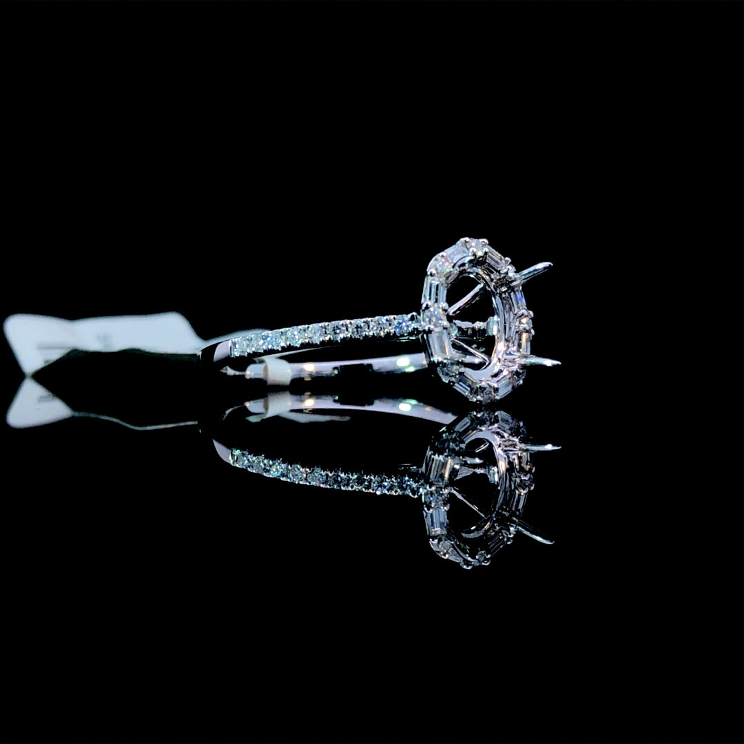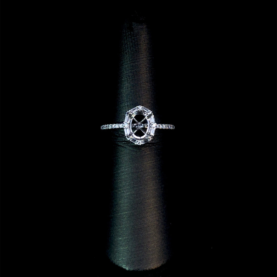 Create a custom engagement ring that's uniquely yours with this elegant .29ctw diamond semi mount. The oval halo showcases an intricate blend of round and baguette diamonds in a mesmerizing alternating design, while sparkling accents line the refined 14kt white gold band. This versatile setting is ready to welcome the center stone of your dreams from our curated selection of loose diamonds. Let this beautiful foundation become the beginning of your love story. Price is for the semi mount only. Center stone will be added at an additional cost. This ring is a size 6.25. If that size is not a perfect fit, first time sizing is free at the time of purchase. Additional sizing fees may apply.