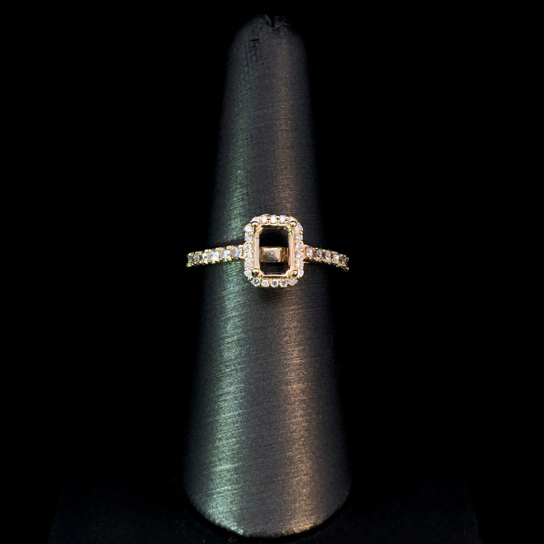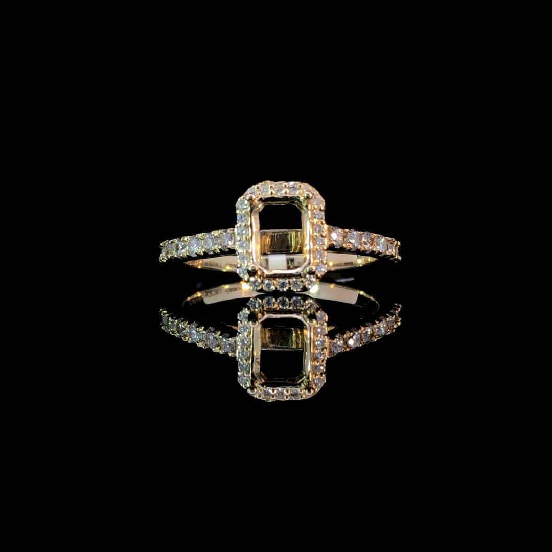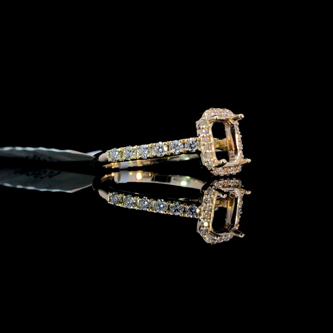 Indulge in timeless elegance with our semi mount featuring a stunning halo design. The band is adorned with a shimmering cascade of diamonds, totaling .41ctw, all set in luxurious 14kt yellow gold. Customize your piece with either an emerald or radiant cut center stone from our collection of loose diamonds for a truly exquisite look. Price is for the semi mount only. Center stone will be added at an additional cost. This ring is a size 7. If that size is not a perfect fit, first time sizing is free at the time of purchase. Additional sizing fees may apply.