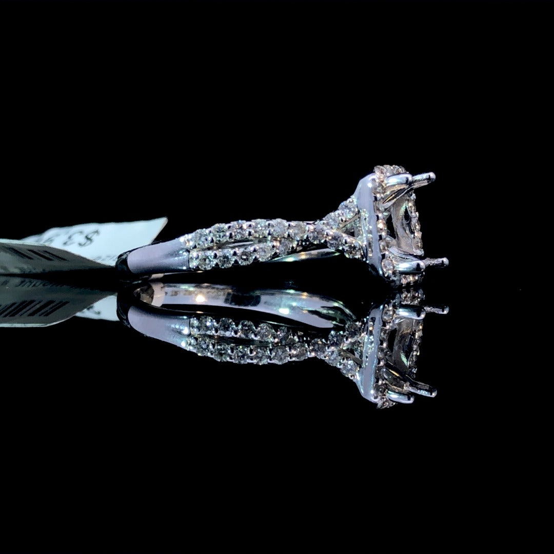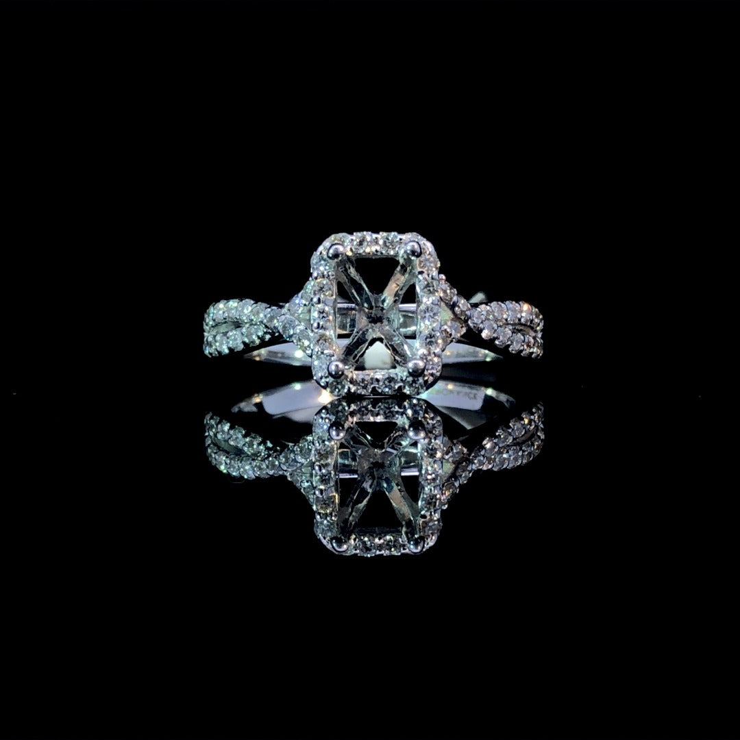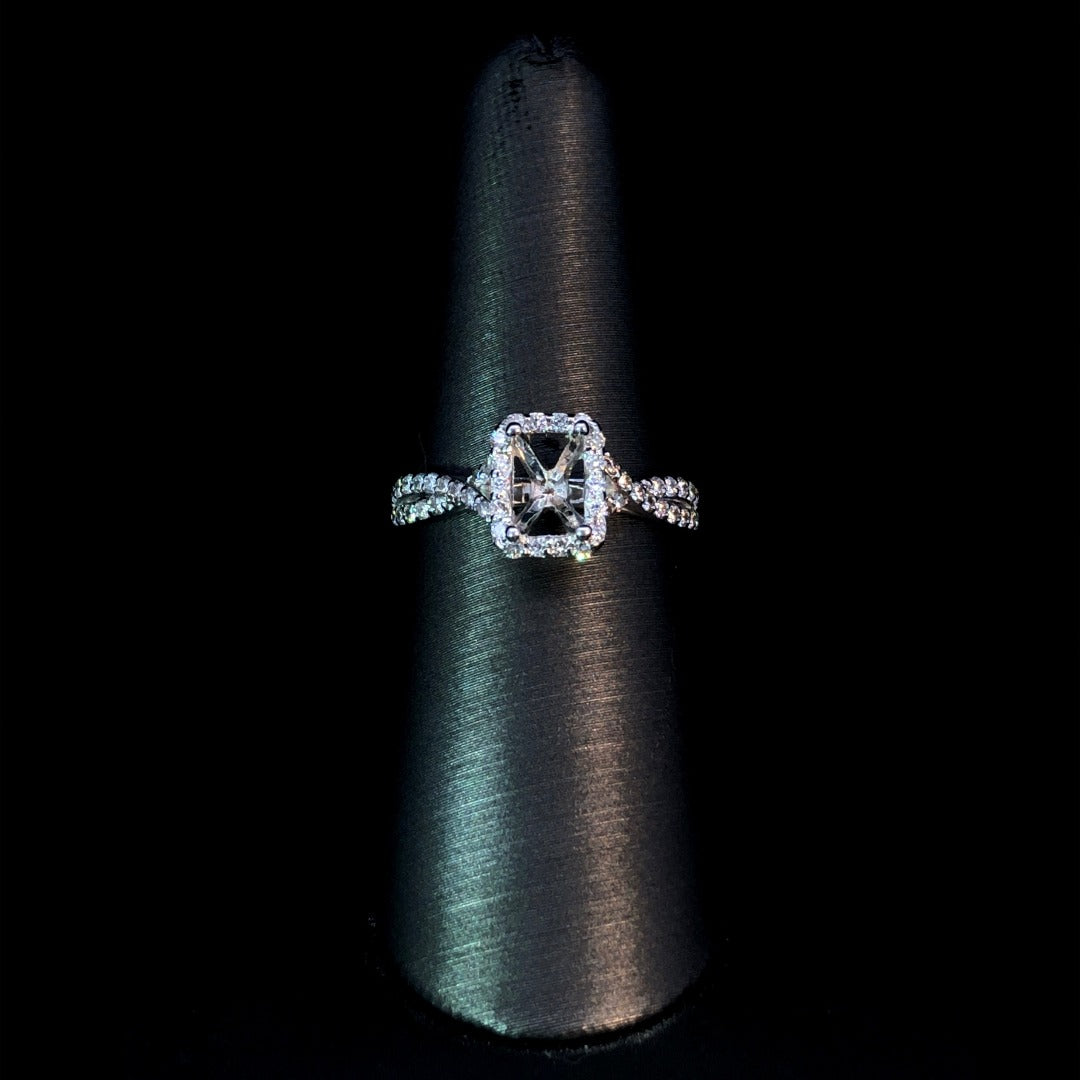Indulge in luxury with this exquisite 14kt white gold semi mount, featuring a rectangular halo and twisted band adorned with .46ctw of round diamonds. Complete the look with a center stone of your choice from our exclusive collection. Elevate your style with this stunning piece. Price is for the semi mount only. Center stone will be added at an additional cost. This ring is a size 7. If that size is not a perfect fit, first time sizing is free at the time of purchase. Additional sizing fees may apply.