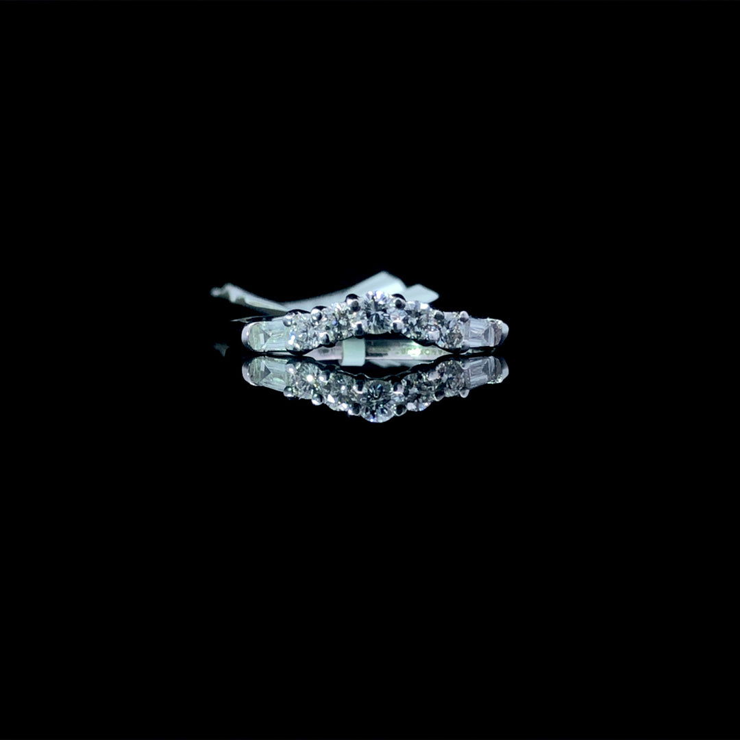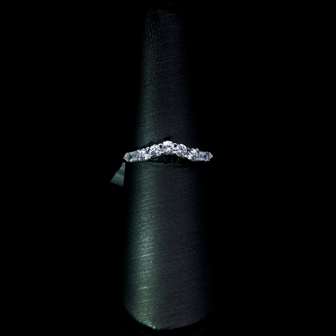 This stunning piece features .45ctw of round and baguette diamonds set in 14kt white gold, adding a subtle sparkle to any outfit. Perfect for special occasions or everyday wear, this band is sure to impress. This ring is a size 7. If that size is not a perfect fit, first time sizing is free at the time of purchase. Additional sizing fees may apply.