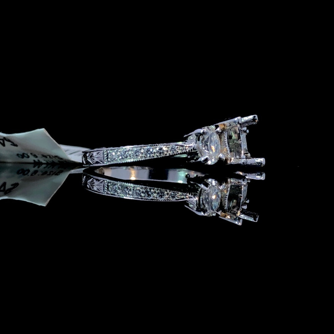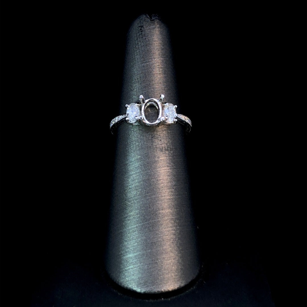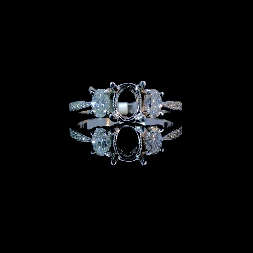 Indulge in luxury with this stunning diamond semi mount. Featuring 2 oval diamond side stones and sparkling round accent diamonds, totaling .53ctw, set in intricately etched 14kt white gold with delicate milgrain details. Complete the piece with your own choice of center stone for a truly exclusive and eye-catching look. Price is for the semi mount only. Center stone will be added at an additional cost. This ring is a size 6. If that size is not a perfect fit, first time sizing is free at the time of purchase. Additional sizing fees may apply.