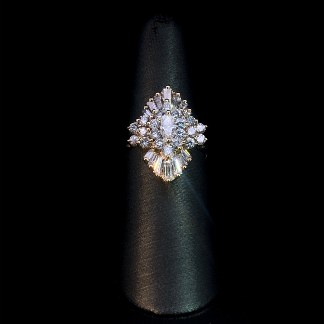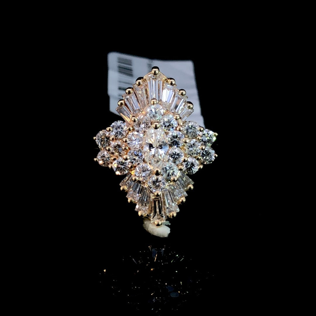 Make a statement with this stunning ring! Adorned with 2.00ctw of sparkling round and baguette diamonds set in luxurious 14kt yellow gold, it's the perfect addition to any jewelry collection. Elevate your style with this must-have piece. This ring is a size 7. If that size is not a perfect fit, first time sizing is free at the time of purchase. Additional sizing fees may apply.