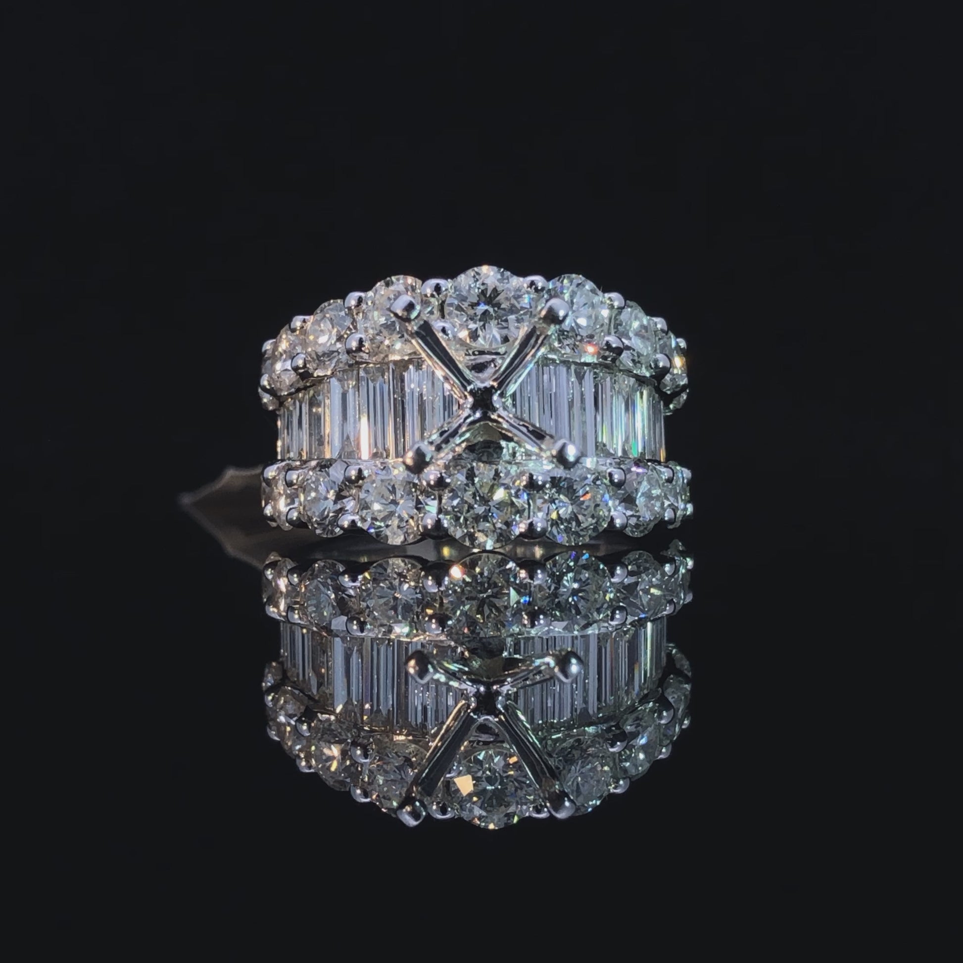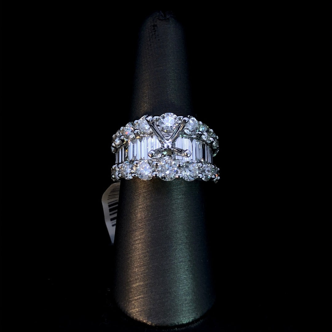 Indulge in luxury with our jaw dropping statement piece. This exquisite ring boasts an impressive total diamond weight of 5.51ctw, adorned with baguette and round diamonds in 14kt white gold. Choose your perfect center stone from our premium loose stone options to complete this exclusive ring. Prepare to turn heads with this one-of-a-kind creation. Price is for the semi mount only. Center sone will be added at an additional cost. This ring is a size 7. If that size is not a perfect fit, first time sizing is free at the time of purchase. Additional sizing fees may apply.