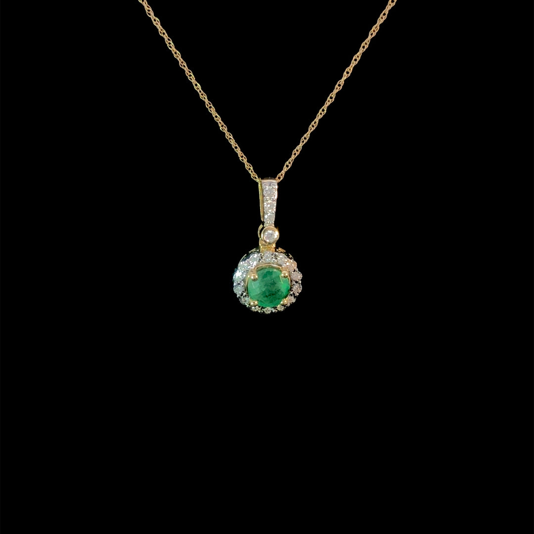 This elegant pendant showcases a stunning .55ct emerald encircled by shimmering .09ctw of round diamond accents. Crafted in 10kt yellow gold, it exudes timeless charm and sophistication. A perfect accessory for any occasion, this pendant is a must-have for any jewelry collection. Chain is not included.