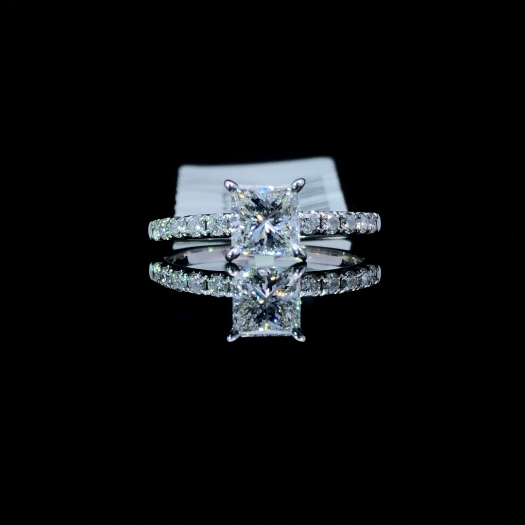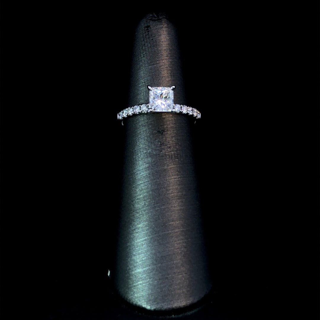 Indulge in timeless elegance with this beautiful ring. The center .69ct princess cut diamond sparkles, complimented by cascading round diamond accents totaling .94ctw. Set in 14kt white gold, this classic piece is sure to add a touch of sophistication to any look. This ring is a size 5. If that size is not a perfect fit, first time sizing is free at the time of purchase. Additional sizing fees may apply.
