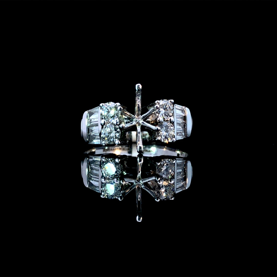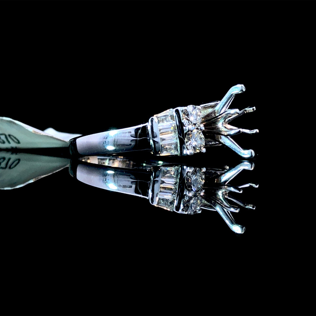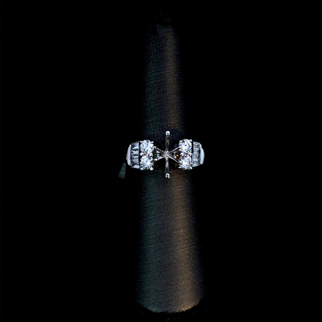 This gorgeous diamond semi mount serves as a stunning foundation for your custom ring. Featuring .74 ctw of round and baguette diamond side stones set in elegant 14kt white gold, it offers plenty of sparkle and sophistication. Personalize this ring by selecting your ideal center stone from our unmatched collection of loose stones, creating a truly unique piece. Price is for the semi mount only. Center stone will be added at an additional cost. This ring is a size 7. If that size is not a perfect fit, first time sizing is free at the time of purchase. Additional sizing fees may apply.