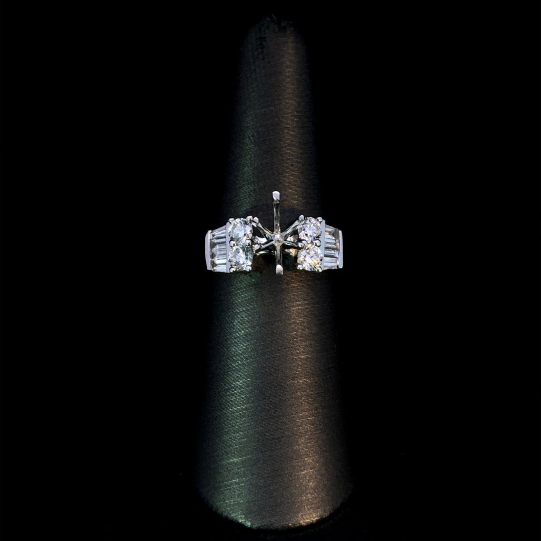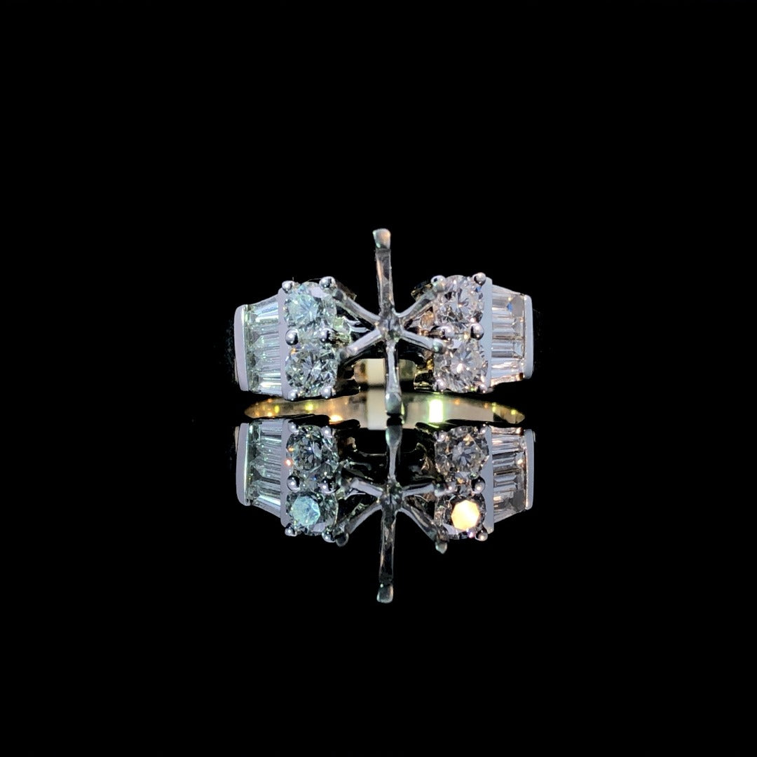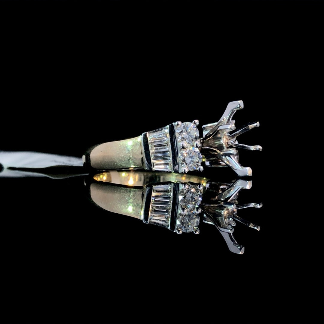 Indulge in luxury with our 14kt 2-tone gold diamond semi mount. The .74ctw of round and baguette side stones, set in white gold, complement the yellow gold shank exquisitely. Choose your own center stone from our vast selection for a truly stunning piece. Elevate your jewelry collection with this statement piece. Price is for the semi mount only. Center stone will be added at an additional cost. This ring is a size 7. If that size is not a perfect fit. first time sizing is free at the time of purchase. Additional sizing fees may apply.