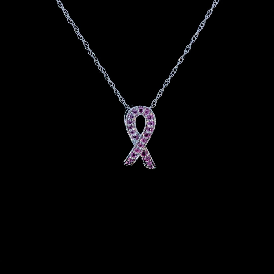 Elevate your look with our chic awareness ribbon pendant, adorned with stunning pink sapphires in 14kt white gold. Radiating a glamorous and sophisticated aura, this piece adds a touch of elegance to any outfit while spreading awareness. Show your support with style and grace. Chain is not included.