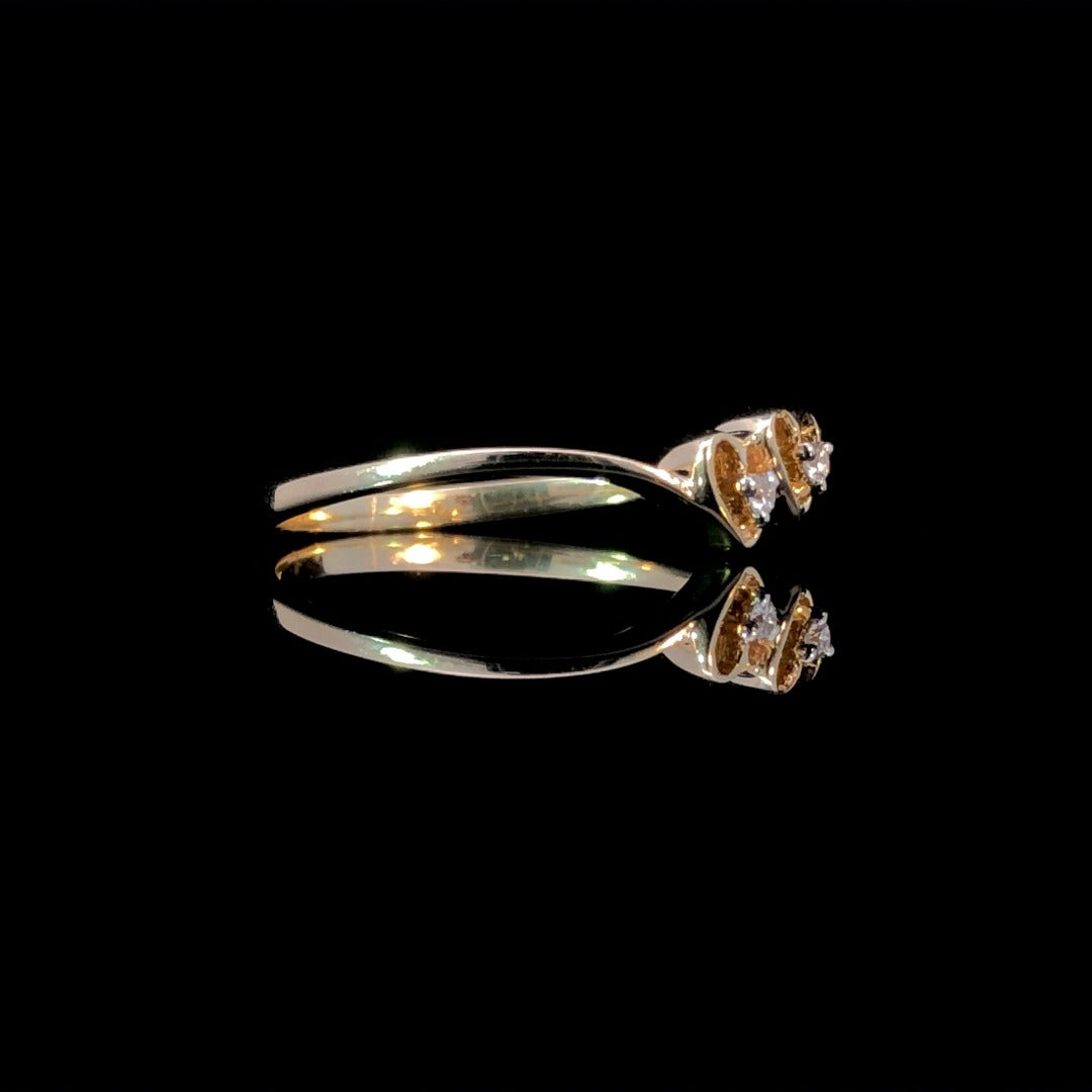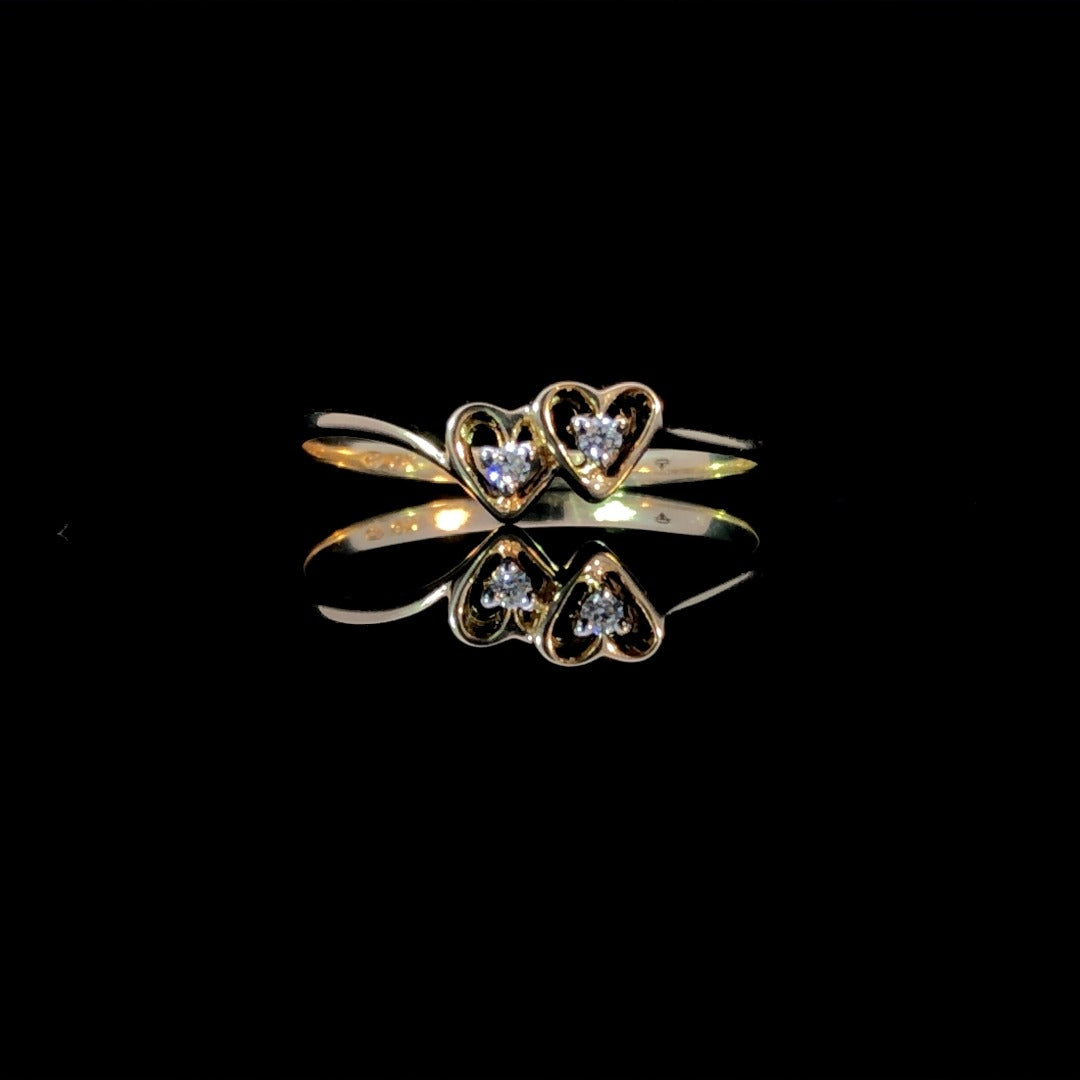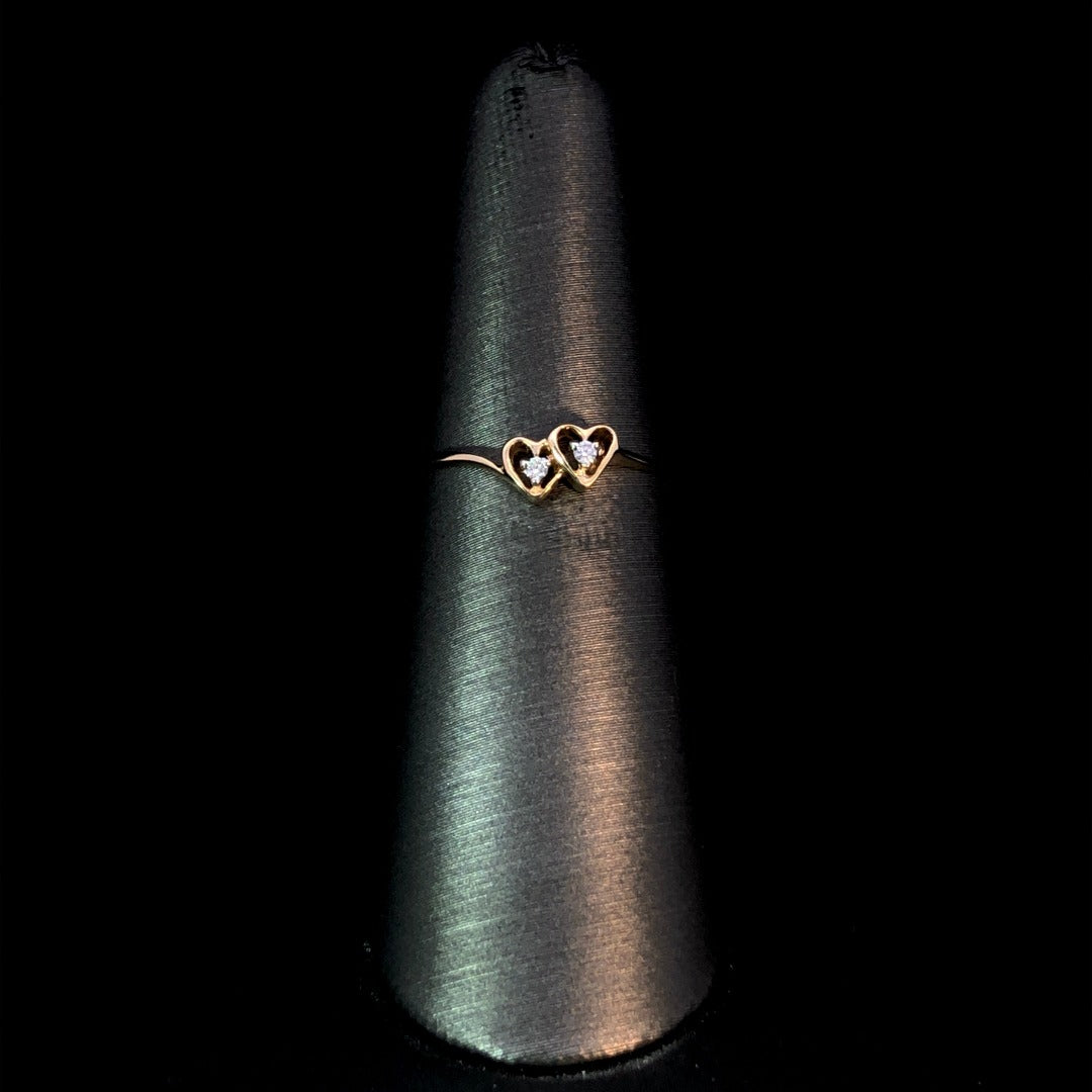 Expertly crafted with a delicate design, this 14kt yellow gold fashion ring features two hearts at the center, adorned with two sparkling round diamonds totaling .02ctw. A perfect symbol of love, elegance, and style. This ring is a size 6.25. If that size is not a perfect fit, first time sizing is free at the time of purchase. Additional sizing fees may apply.