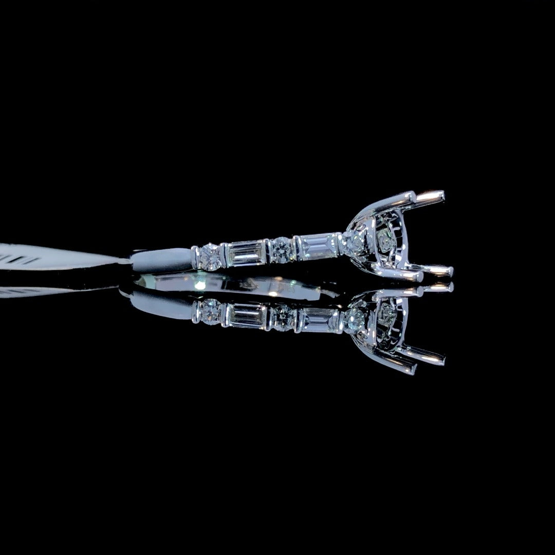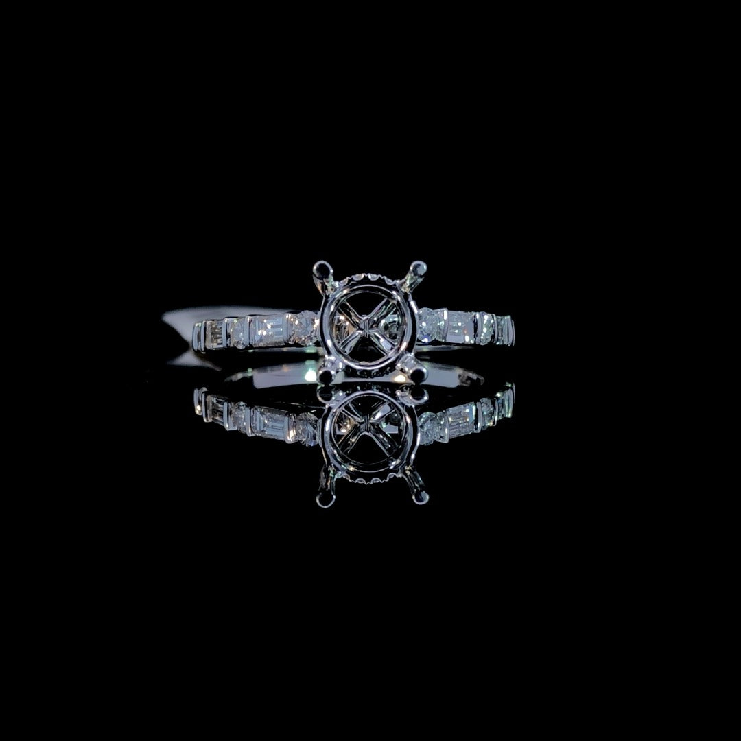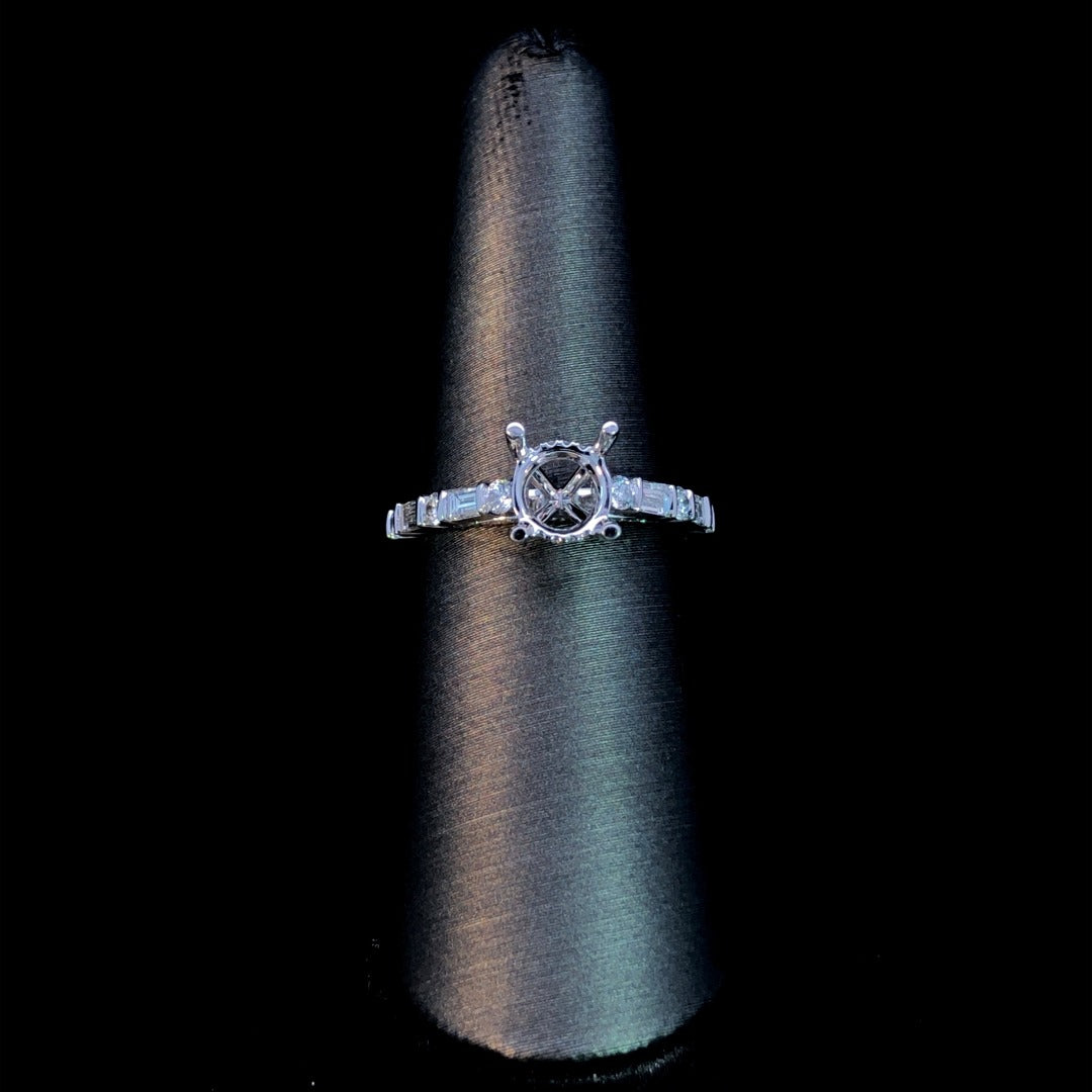Elevate your style with this stunning diamond semi mount. The partial hidden halo and alternating round and baguette diamonds on the white gold band exude sophistication. Choose the perfect center stone from our unmatched selection to complete the .62ctw total diamond weight piece. Luxury, redefined. Price is for the semi mount only. Center stone will be added at an additional cost. This ring is a size 7. If that size is not a perfect fit, first time sizing is free at the time of purchase. Additional sizing fees may apply.