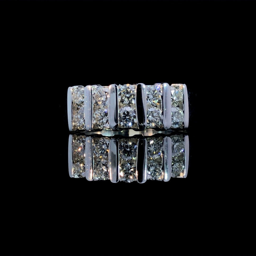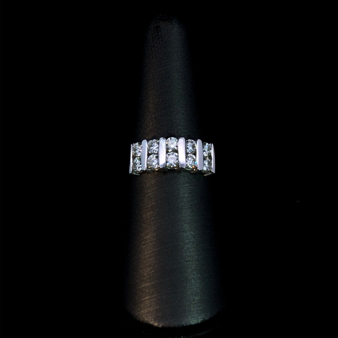 Indulge in luxury with this gorgeous diamond band. Adorn your finger with 1.06ctw of sparkling round diamonds, perfectly set between 14kt white gold bars. Enhance any outfit with this exquisite and sophisticated accessory. This ring is a size 7.75. If that size is not a perfect fit, first time sizing is free at the time of purchase. Additional sizing fees may apply.