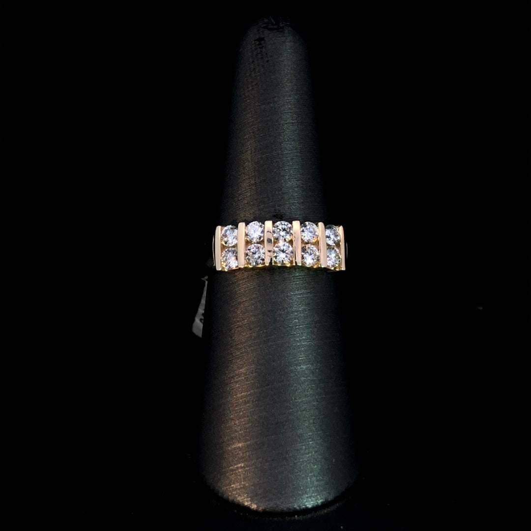 This stunning diamond band features .85ctw of brilliant round diamonds, elegantly set in 14kt yellow gold. A perfect choice for those seeking luxury and sophistication, this band will add a touch of glamour to any outfit. Make a statement with this gorgeous piece. This ring is a size 7.25. If that size is not a perfect fit, first time sizing is free at the time of purchase. Additional sizing fees may apply.